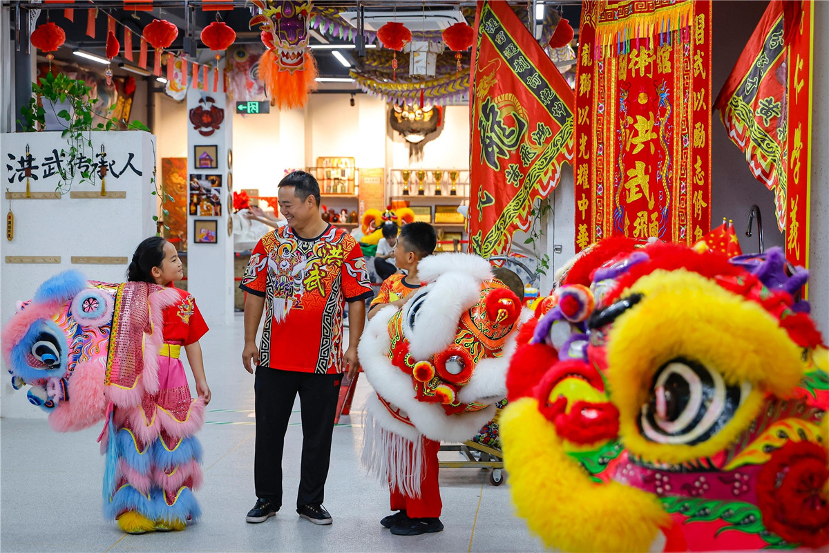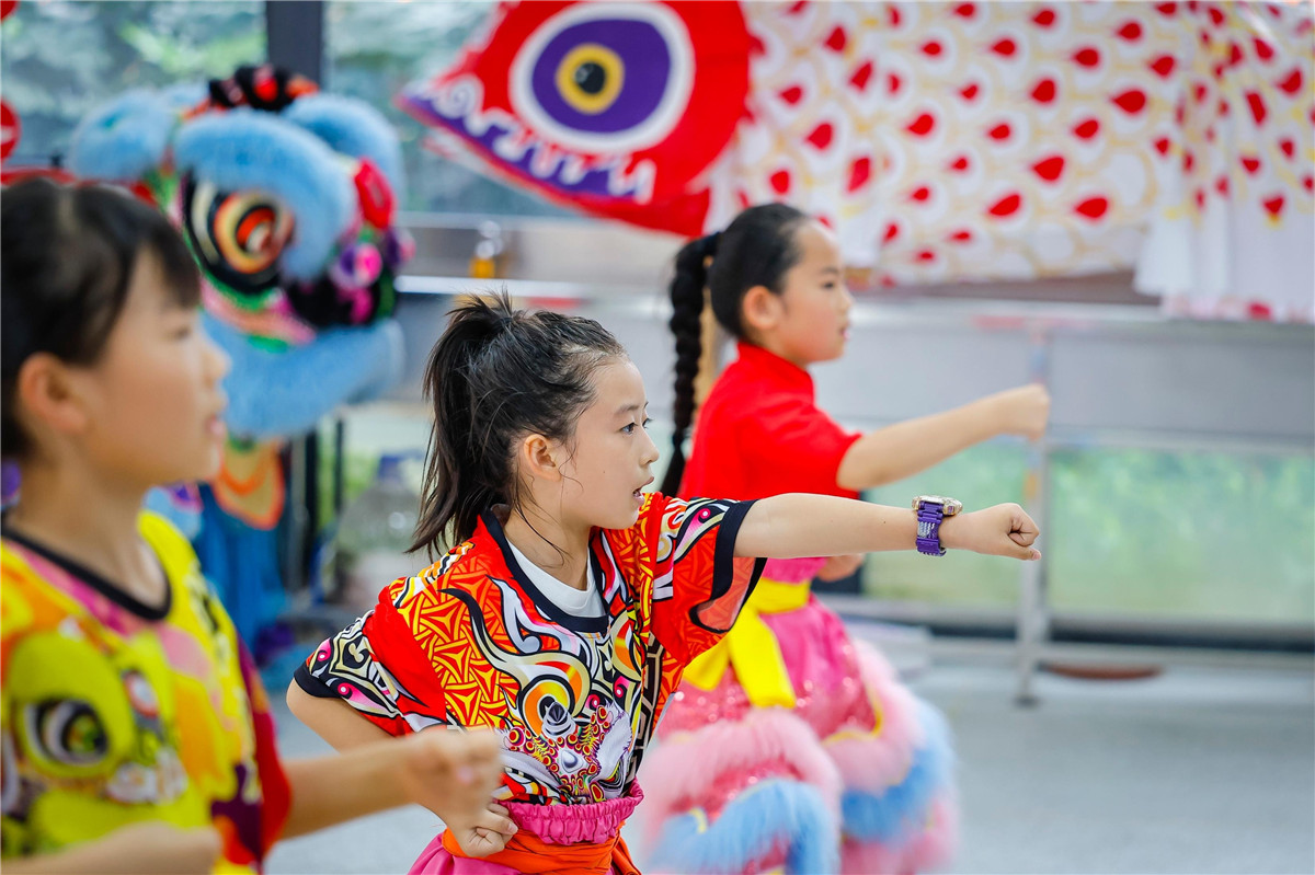 比赛现场,4头色彩鲜艳的狮子在阳光下熠熠生辉。雄狮时而起跃,时而翻滚,将威武与灵动展现得淋漓尽致。狮头之下,是一张张稚气未脱的脸庞,步伐整齐,配合默契,很难想象这是一群以女孩为主、平均年龄不到10岁的孩子。随着最后一声鼓点落下,现场掌声如雷,她们最终夺得青少年群狮项目的冠军。赛后一周,在合肥市瑶海区青年创意田园的非遗传承馆,记者见到了这群特别的女孩。“这里目前约有20名学习醒狮的孩子,其中女孩占大多数。寒暑假孩子们会集中训练,本地孩子还可以利用周末下午到晚上的时间练习。”总教练徐飞雨一边指导孩子们训练一边向记者介绍。