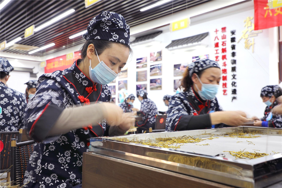 10月30日,六安开发区九仙尊石斛文博园,参赛选手在进行霍山石斛非遗炮制技艺实操竞技。当天,34名选手通过“理论+实操”的方式同堂竞技,展示霍山石斛炮制的质量和工艺水平。本报通讯员 田凯平 李必梅 摄