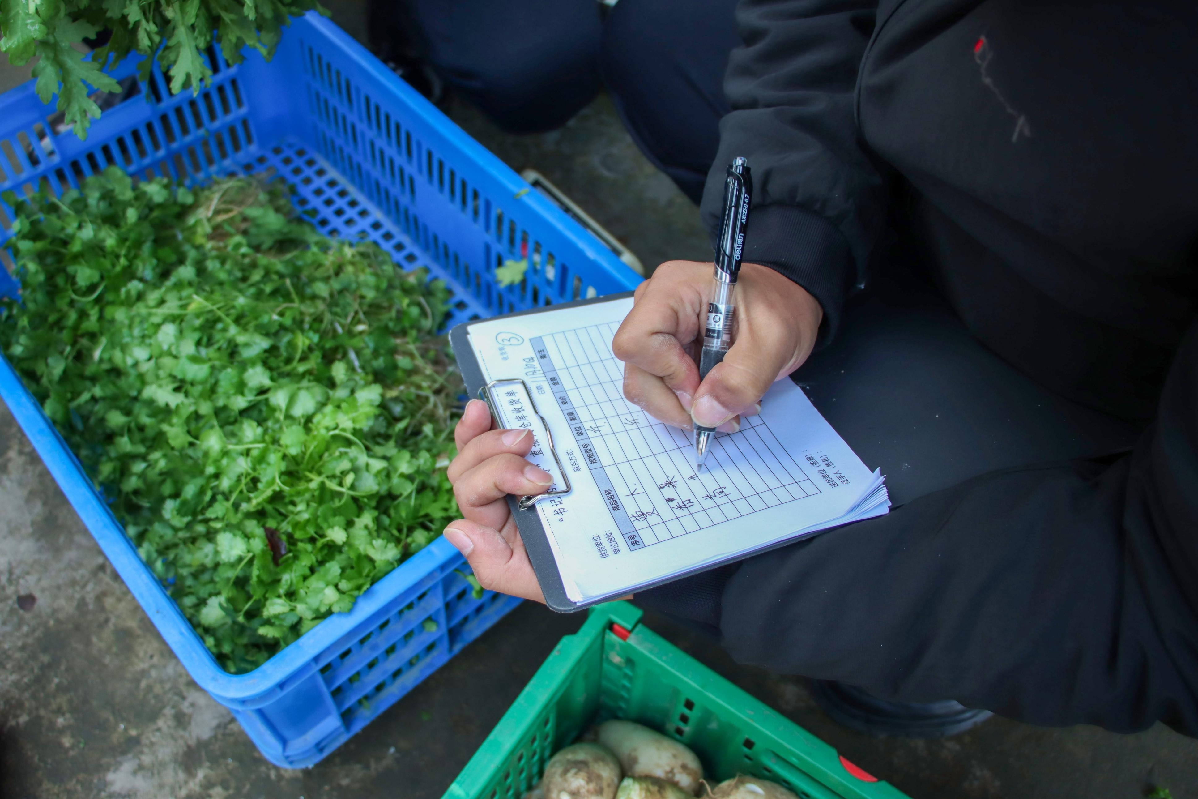 11月10日,庐江县“书记四人寻”直播间工作人员在登记村民送来售卖的蔬菜。