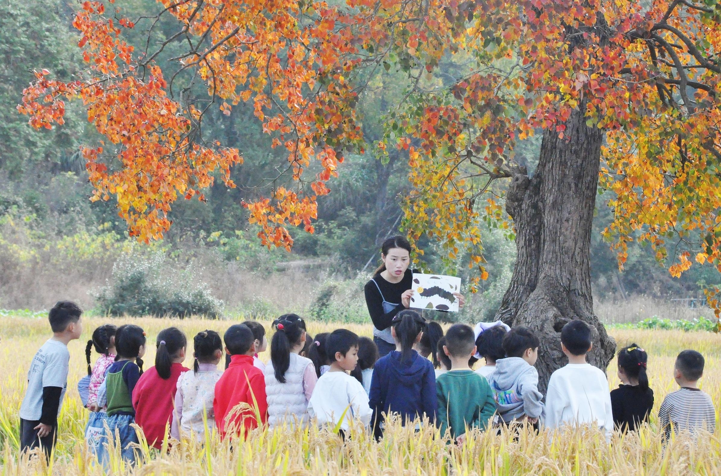 11月11日,黟县宏村景区附近的稻田里,一群萌娃跟随老师识别稻谷、捡拾红叶、绘制自然美景,体验大自然之妙趣。本报通讯员 朱光明 摄