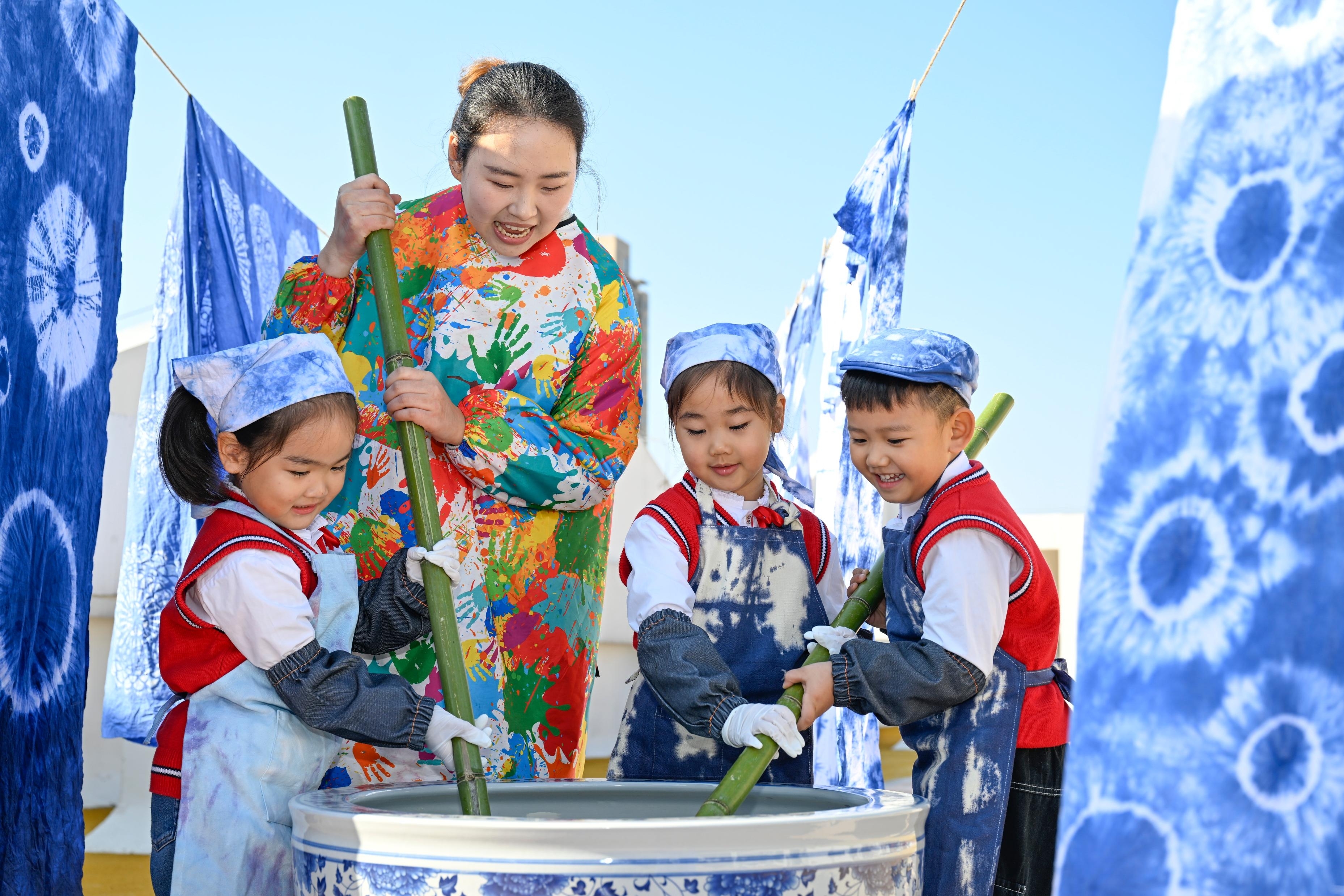 11月11日,在合肥市大西门幼儿园教育集团固镇路分园,小朋友们在学习体验非遗扎染技艺。本报通讯员 赵明 摄