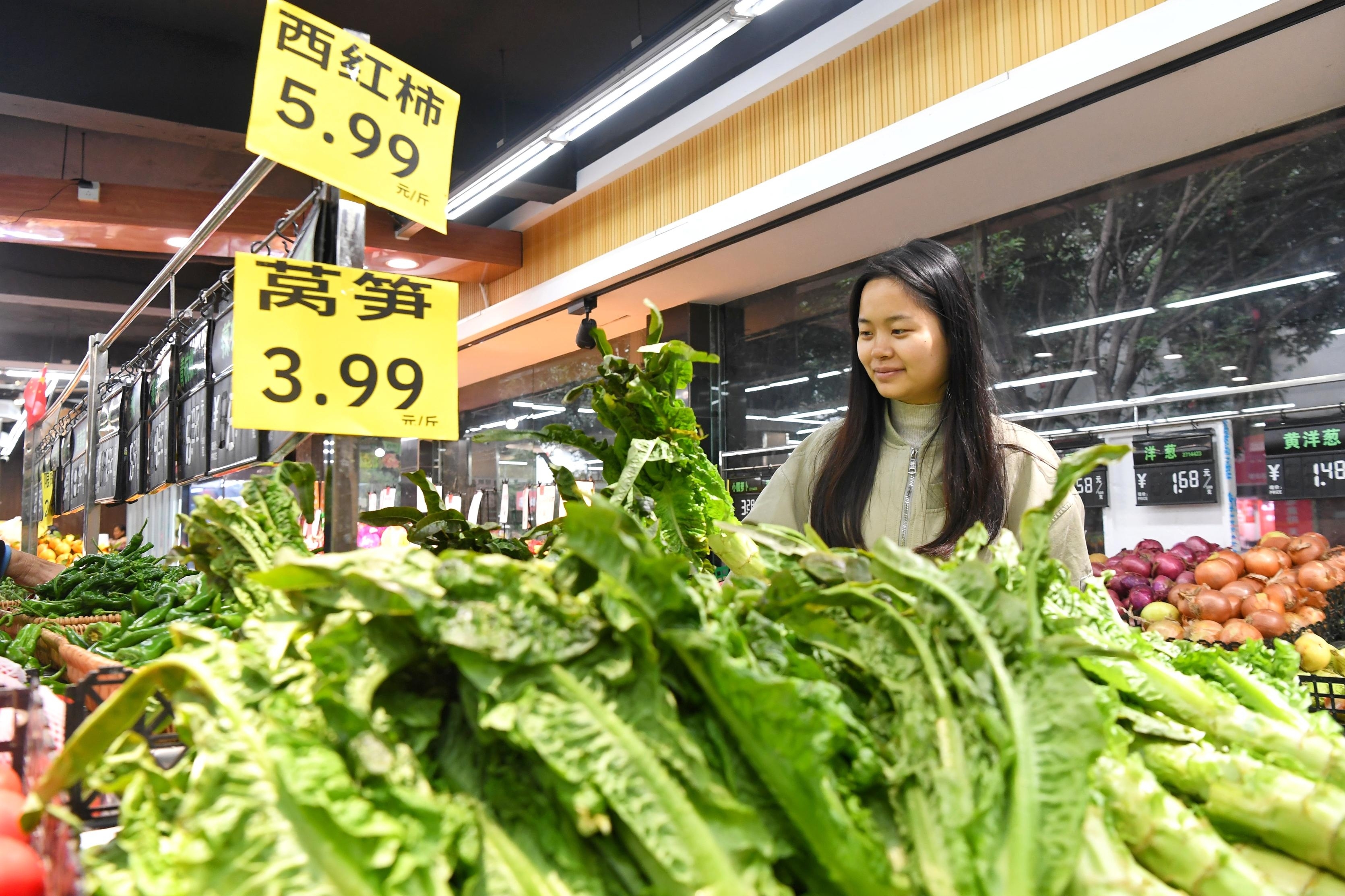 11月17日,位于合肥市蜀山区琥珀街道北苑村社区的一家超市内,市民在选购新鲜蔬菜。受寒潮影响,多地气温骤降。蜀山区积极做好蔬菜保供应工作,保障市民拎稳“菜篮子”。