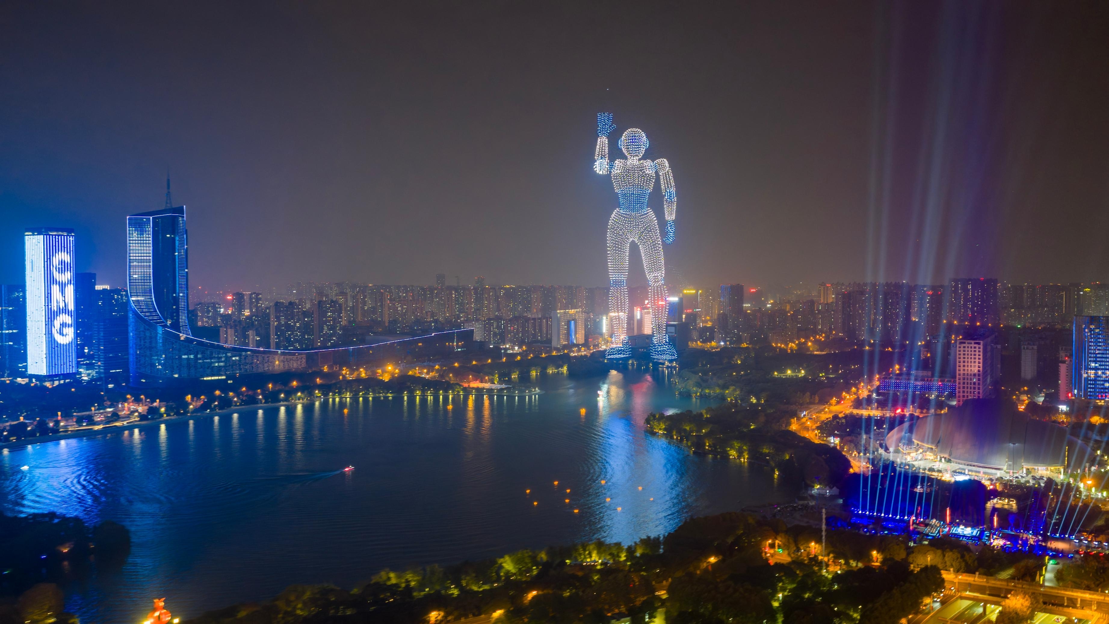 11月16日晚,央视总台“科晚”《中国科技创新盛典》在合肥天鹅湖开启录制,环湖楼宇亮起绚丽的科技蓝灯光秀。“科晚”是中央广播电视总台推出的以科技创新为主题的晚会,旨在通过科技与艺术的融合,展现中国科技创新成果,普及科学知识,激发公众对科技的兴趣,向全国观众传递“中国科技,正当潮”的自信与力量。作为“科晚”录制地,合肥已经成为中国面向世界的一张“科学名片”。图为无人机群在空中组成机器人造型。