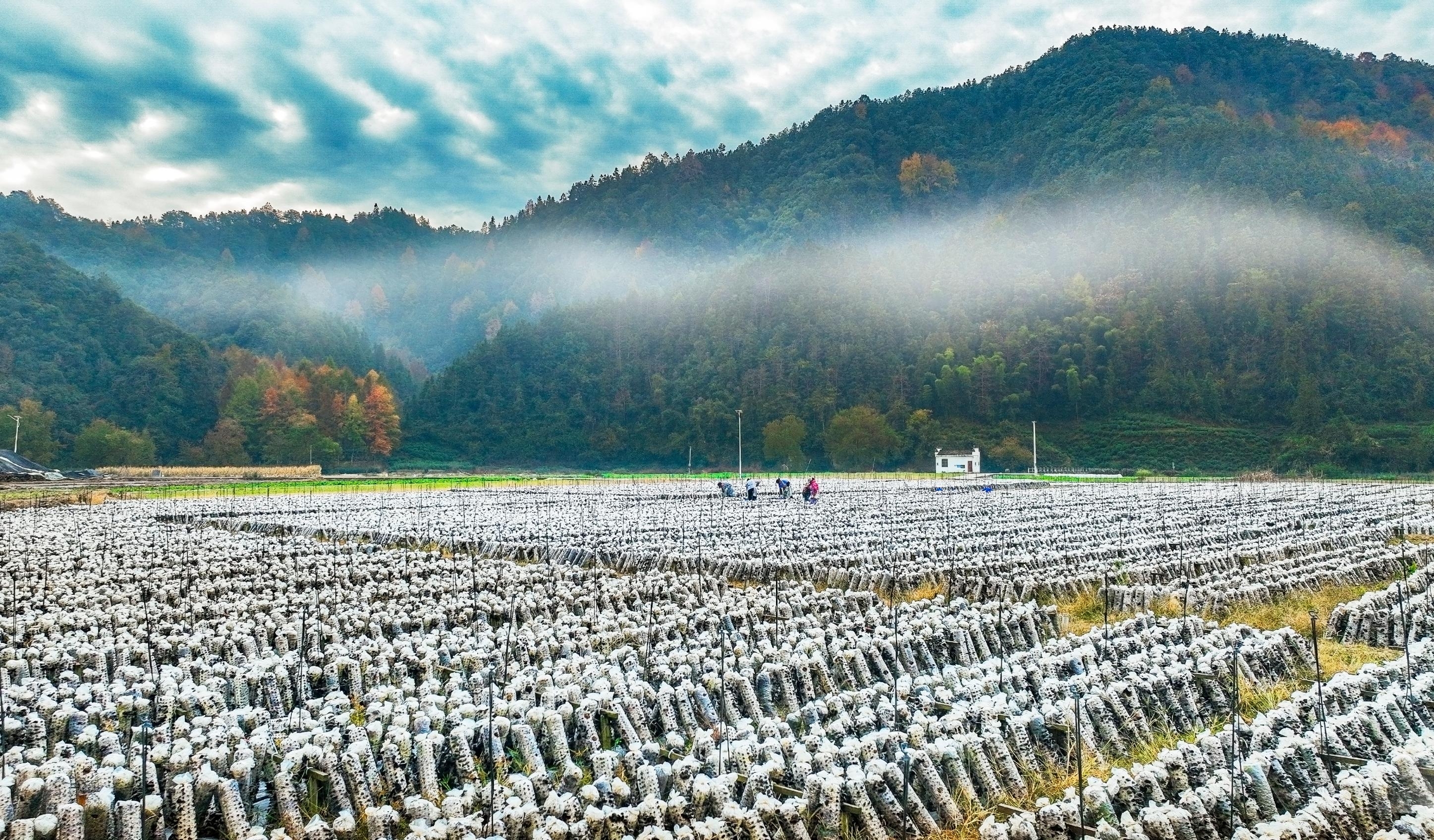 11月24日,歙县森村乡渔岸村木耳种植基地,村民穿梭在田间采收成熟的黑木耳。