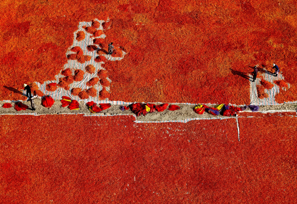 连日来,亳州市谯城区双沟镇的农民在晾晒辣椒。冬日时节,在亳州市农村,农民利用晴好天气,晾晒火红的辣椒,成为冬日乡村一道亮丽的风景。