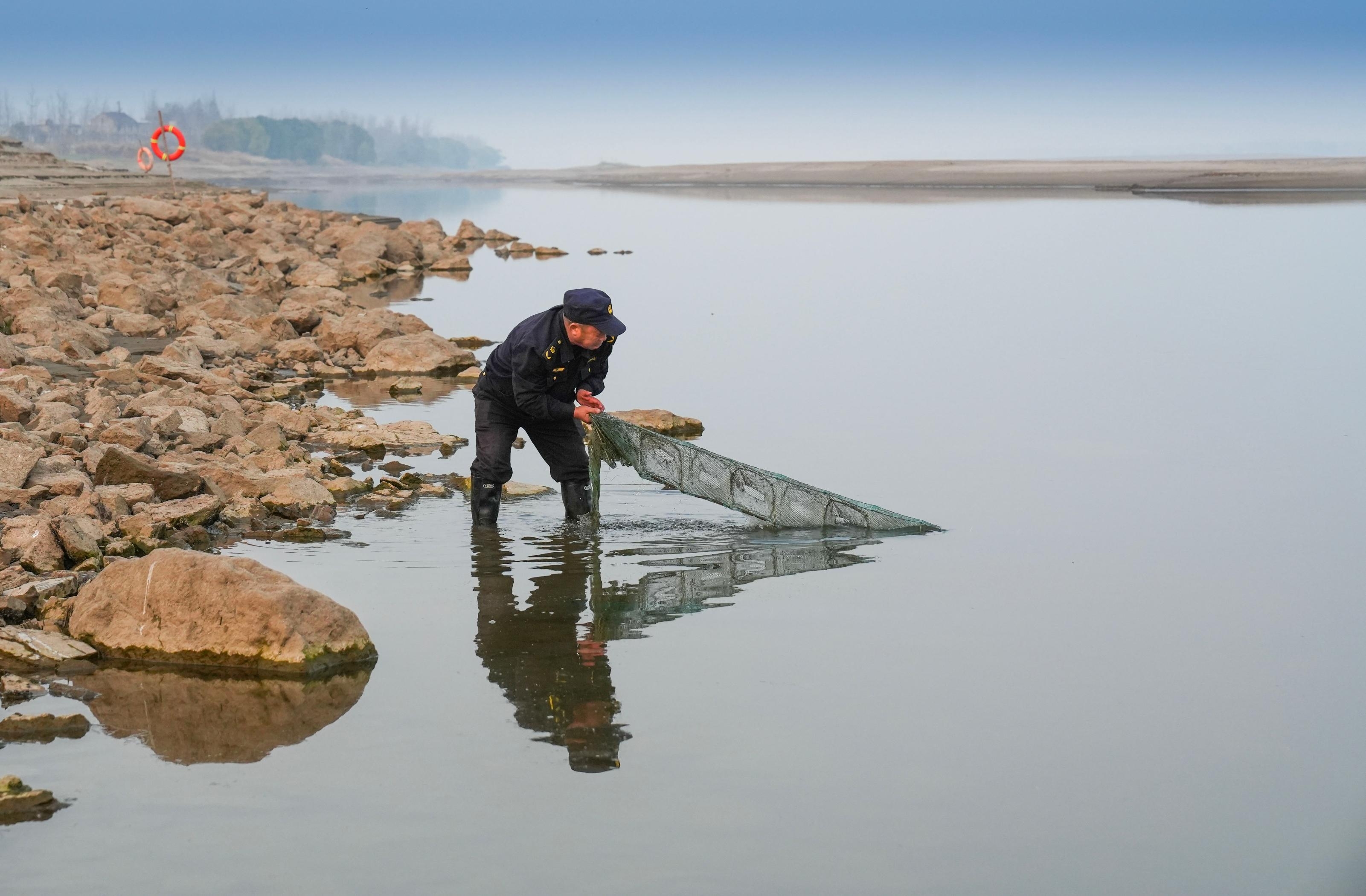 12月10日,在望江县雷池镇雷江村江边,江豚巡护员程桂应在清理非法捕鱼者的渔网。