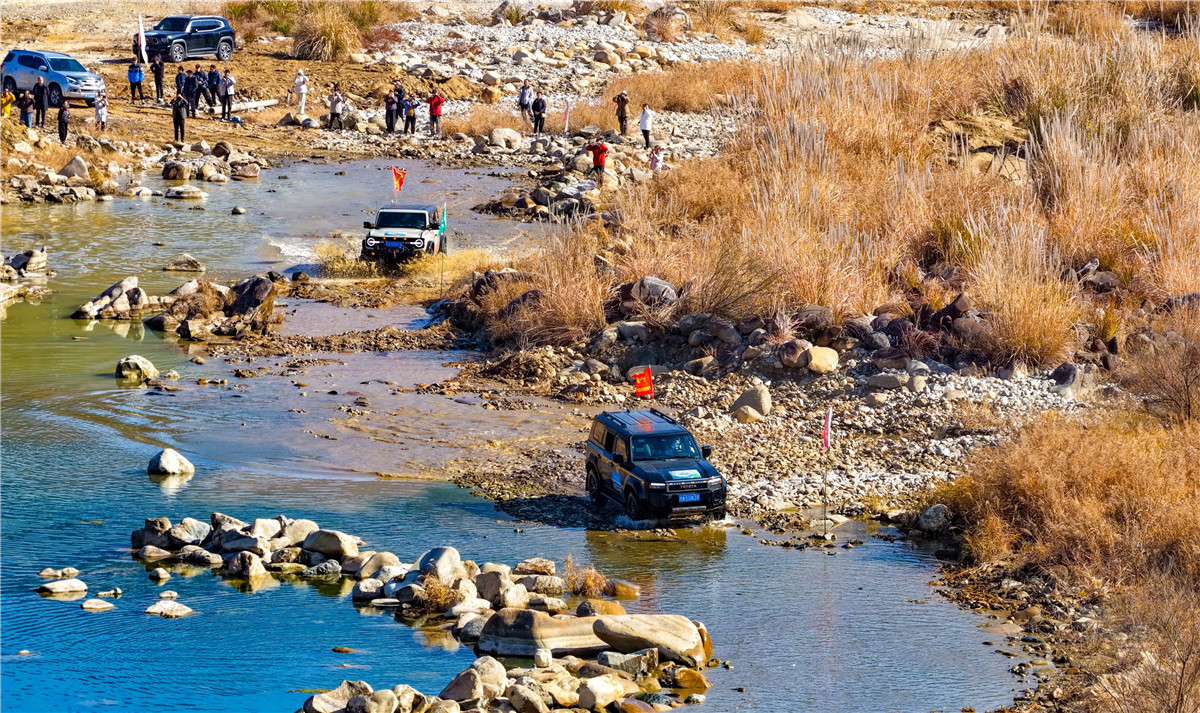 12月14日,车友在岳西县菖蒲镇岩河村境内的天仙河景区开展自驾越野车穿越河道比赛,体验越野运动激情。本报通讯员 王先国 摄