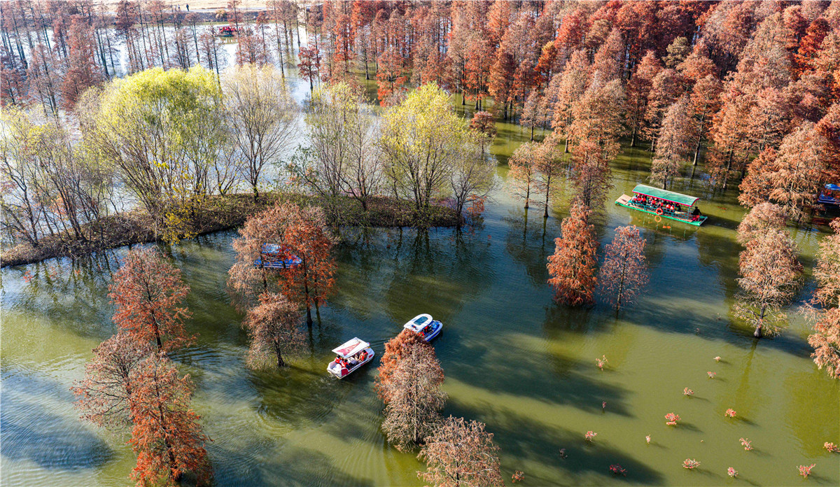 12月14日,庐江县柯坦镇城池村千年大汉塘里的数千株池杉树树叶已经全部变红,引来八方游客观赏打卡。本报通讯员 巢志斌 摄