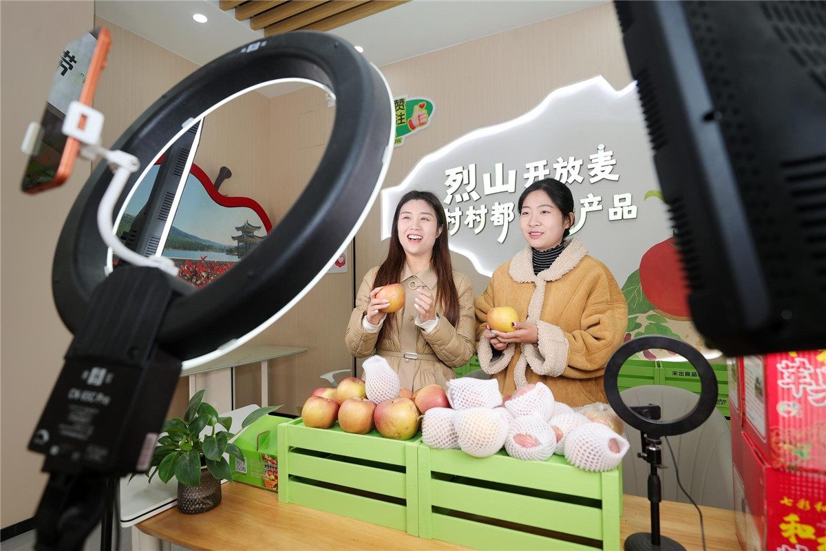 近日, 在淮北市烈山区宋疃镇智慧物流园农产品展销中心的“烈山农场”线上农特产品超市,工作人员在帮助农户直播销售特色农产品。本报通讯员 冯树风 摄