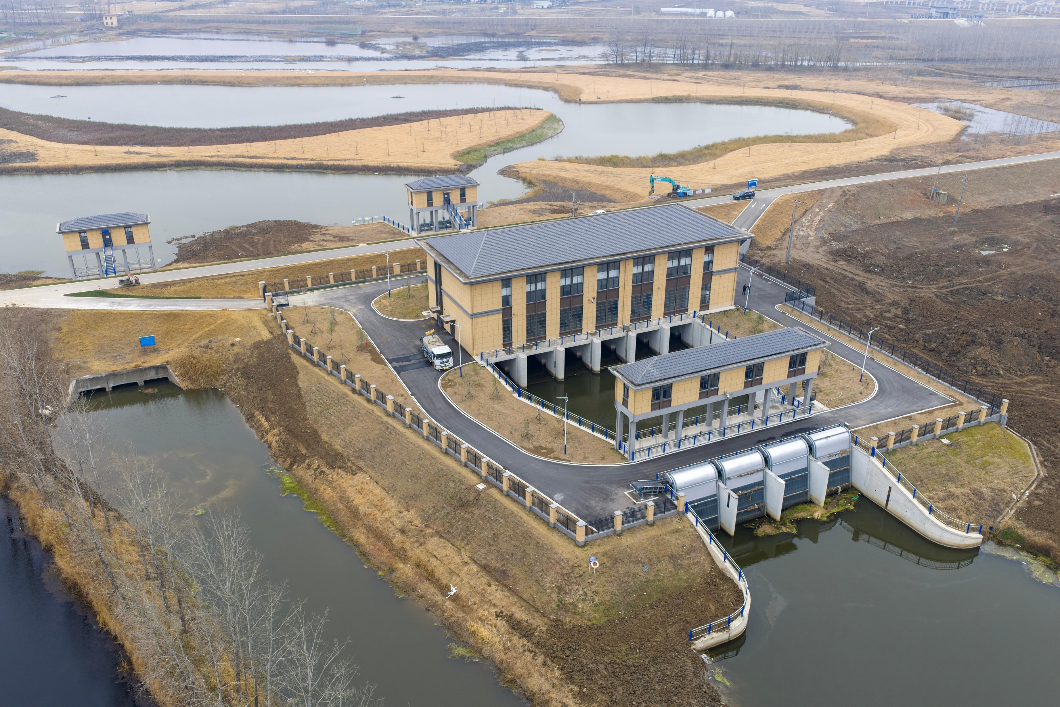 12月25日,淮河流域重要行蓄洪区霍邱段2标工程顺利通过完工验收,由中铁十二局集团有限公司承建的相关工程全面完成并投用。图为无人机航拍的霍邱段2标茅桥排涝站全景。