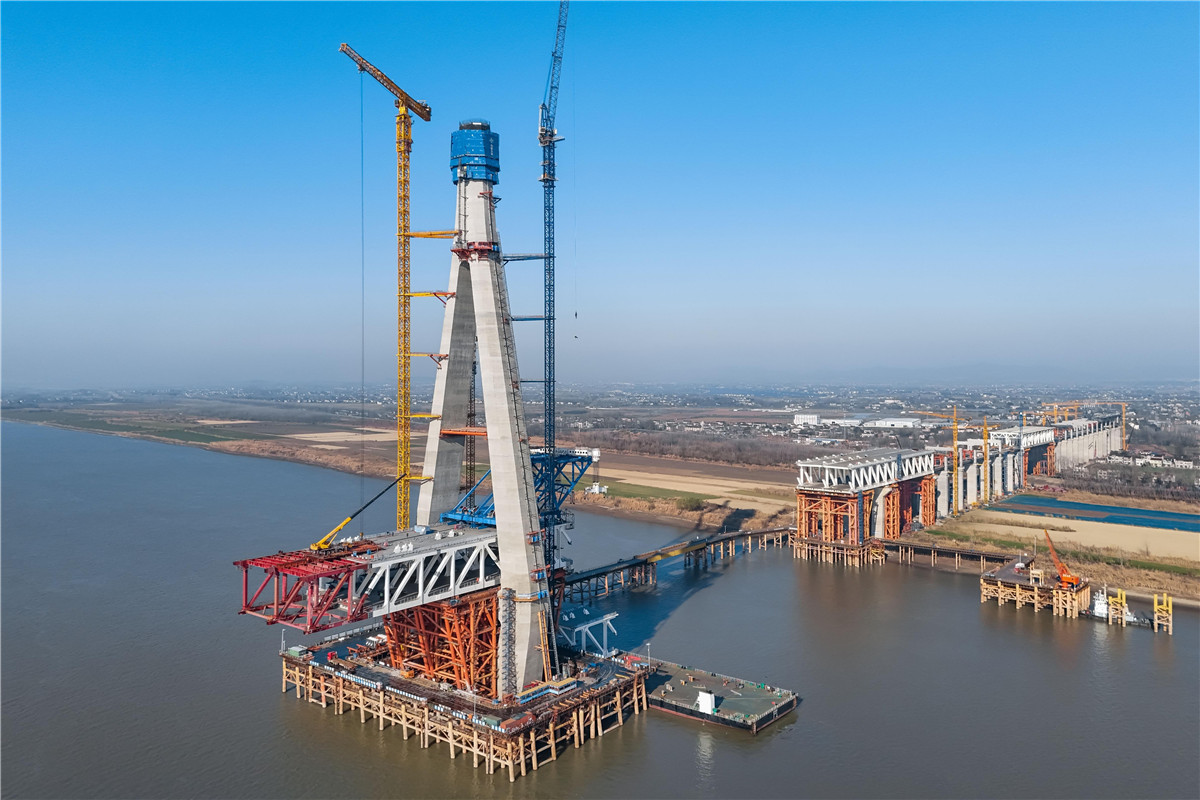12月26日,位于枞阳县的池州长江公铁大桥一标段项目现场,建设人员在进行北主塔塔柱施工和钢桁梁架设作业。池州长江公铁大桥总长3108.5米,采用双向六车道高速公路和四线铁路的桥梁结构,其中大桥一标段线路长1759.7米,目前北引桥桩基、承台、铁路墩身、铁路现浇梁已全部完成。