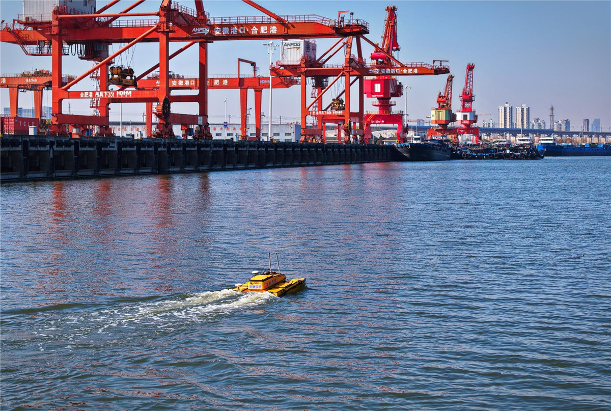 12月26日,合肥港,无人船对码头港池水下地形进行扫测。安徽省交通科学研究院直属的领航水下技术公司,通过自主研发的“内河水下工程可视化智能检测系统”为涉水基础设施及水下工程“把脉问诊”。