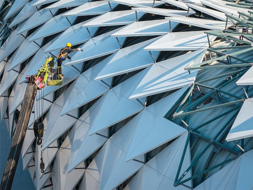 1月8日,工人在宿州市奥体中心项目现场进行作业。该中心是2026年安徽省第十六届运动会、第九届省残运会、第十届省少数民族传统体育运动会的开闭幕式主会场,涵盖体育场、游泳馆、综合型全民健身中心及配套设施等。目前,体育场看台主体、钢结构施工已完成,室内外装饰装修及屋面施工作业已进入收尾阶段,预计今年3月投入使用。