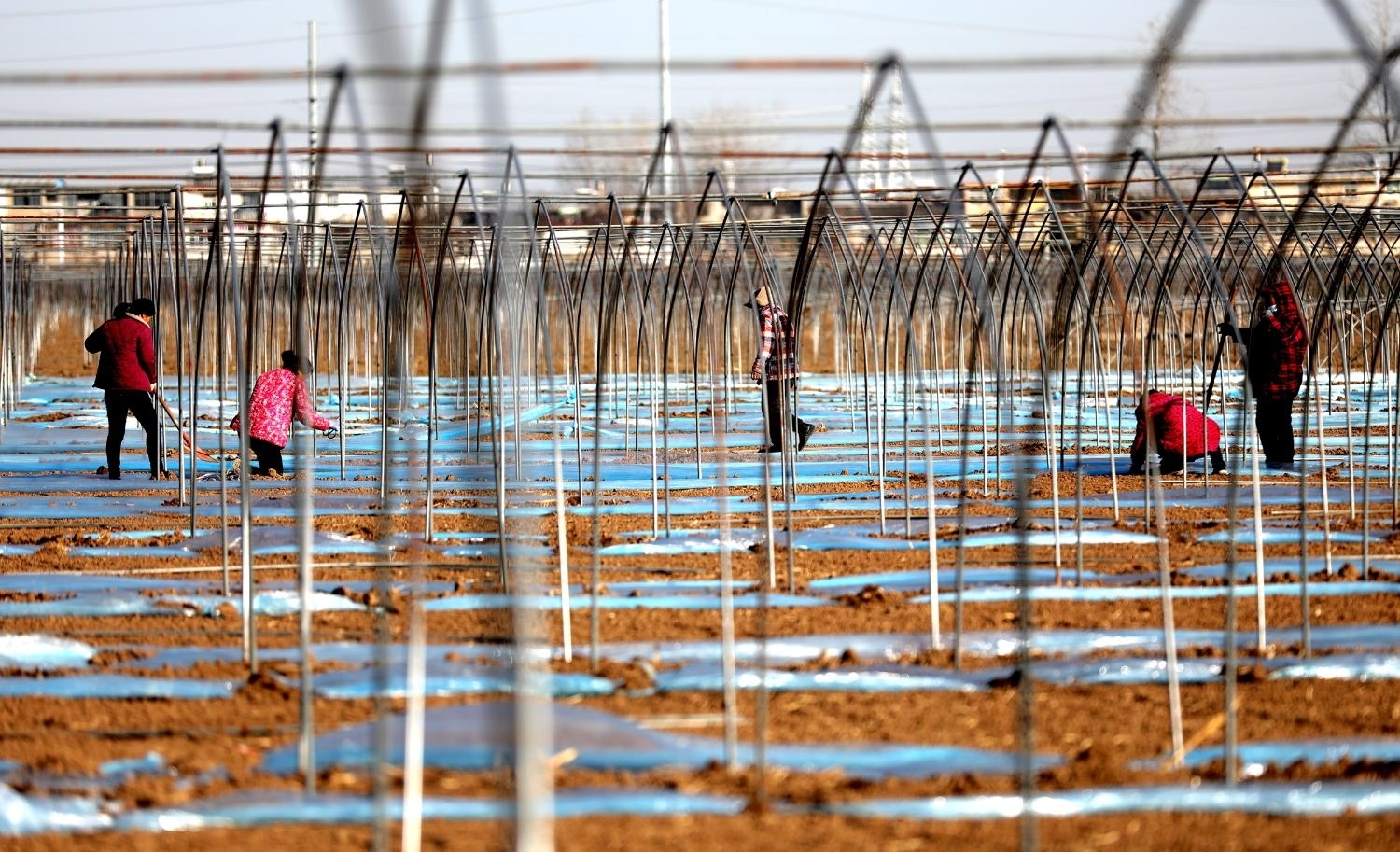 1月11日,阜阳市颍东区新华街道杨付村,村民在给西瓜大棚覆膜培土。连日来,当地农民积极开展麦田管护、建棚栽苗等农事活动,田间地头一派“冬闲农不闲”景象。本报通讯员 宿飞 摄