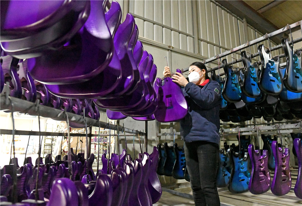 1月14日,淮南市乐森黑马乐器有限公司工人生产电吉他、电贝司等乐器,出口海外市场。特约摄影 陈彬 摄