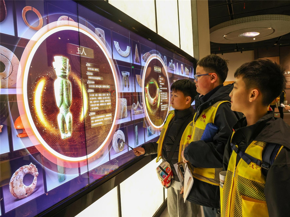 3月21日,马鞍山含山县凌家滩国家考古遗址公园,学生通过互动平台了解凌家滩五千年历史文化的独特魅力。本报通讯员 张道平 琚娟娟 摄