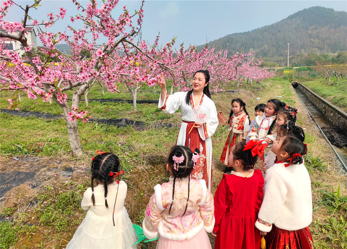 3月25日,一群身着汉服的小朋友走进安庆市宜秀区杨桥镇鲍冲湖村栗树湾水果采摘园,在老师带领下亲近自然,解锁桃花、梨花生长的奥秘。 视觉中国供图