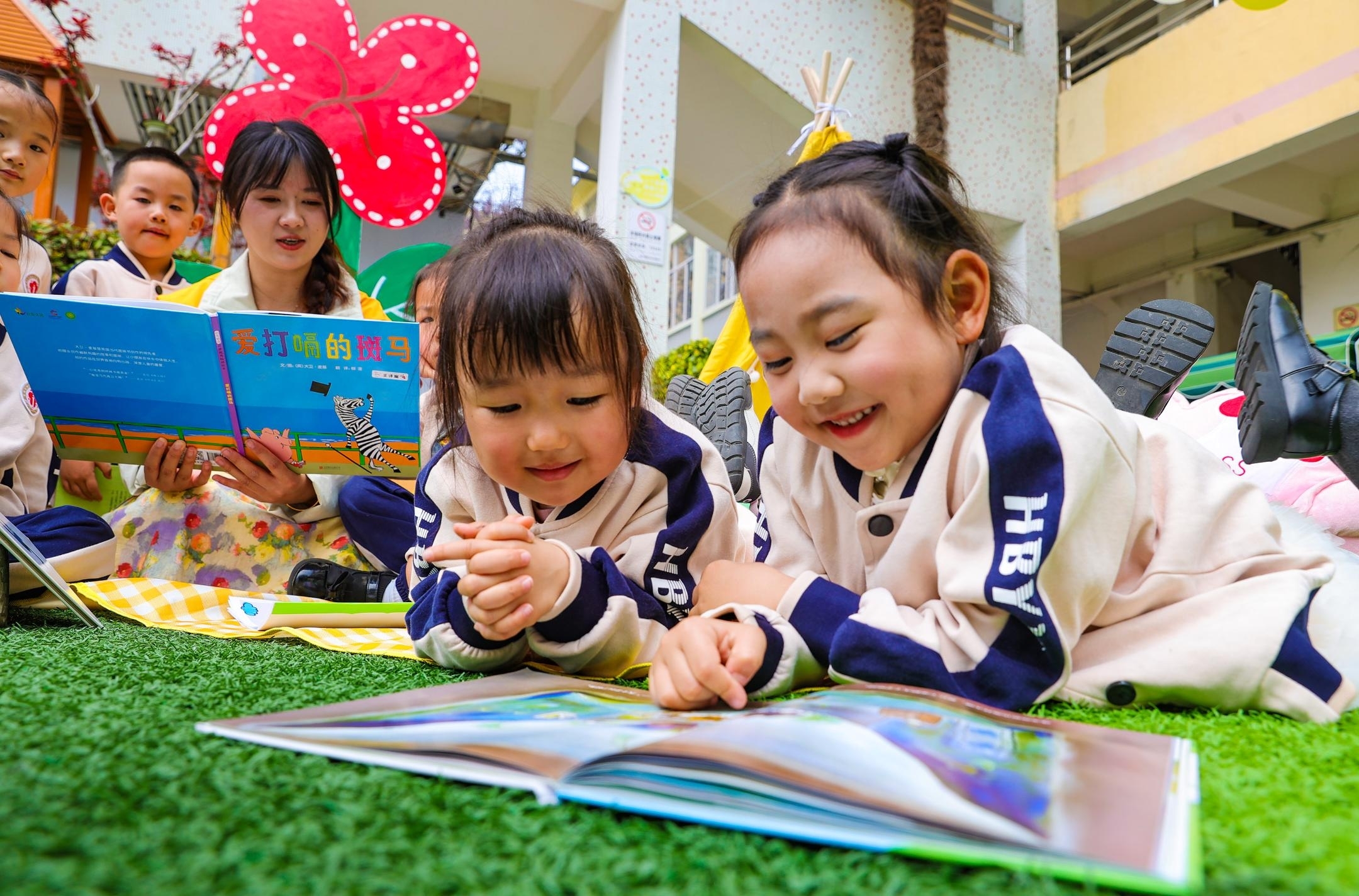 4月21日,淮北市第一幼儿园的老师带领小朋友阅读绘本故事,激发孩子们的阅读兴趣,享受阅读带来的快乐。本报通讯员 冯树风 杨培 摄