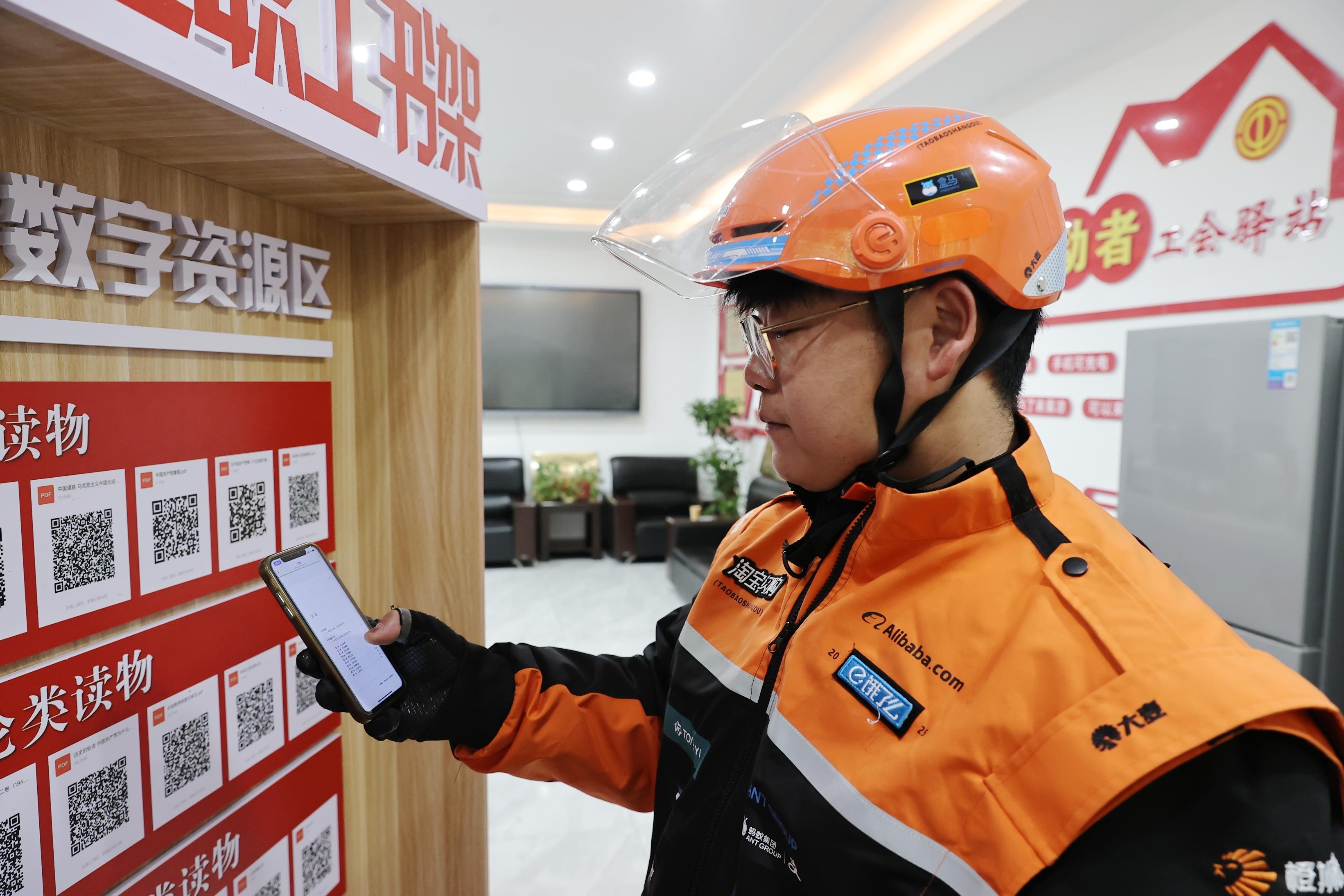 4月21日,外卖员在淮北市相山区职工服务中心工会驿站书吧内扫码阅读。近年来,相山区总工会在工会驿站内精心打造“小哥”书吧,供快递员、外卖员等新就业群体阅读。本报通讯员 张锋 刘晴 摄