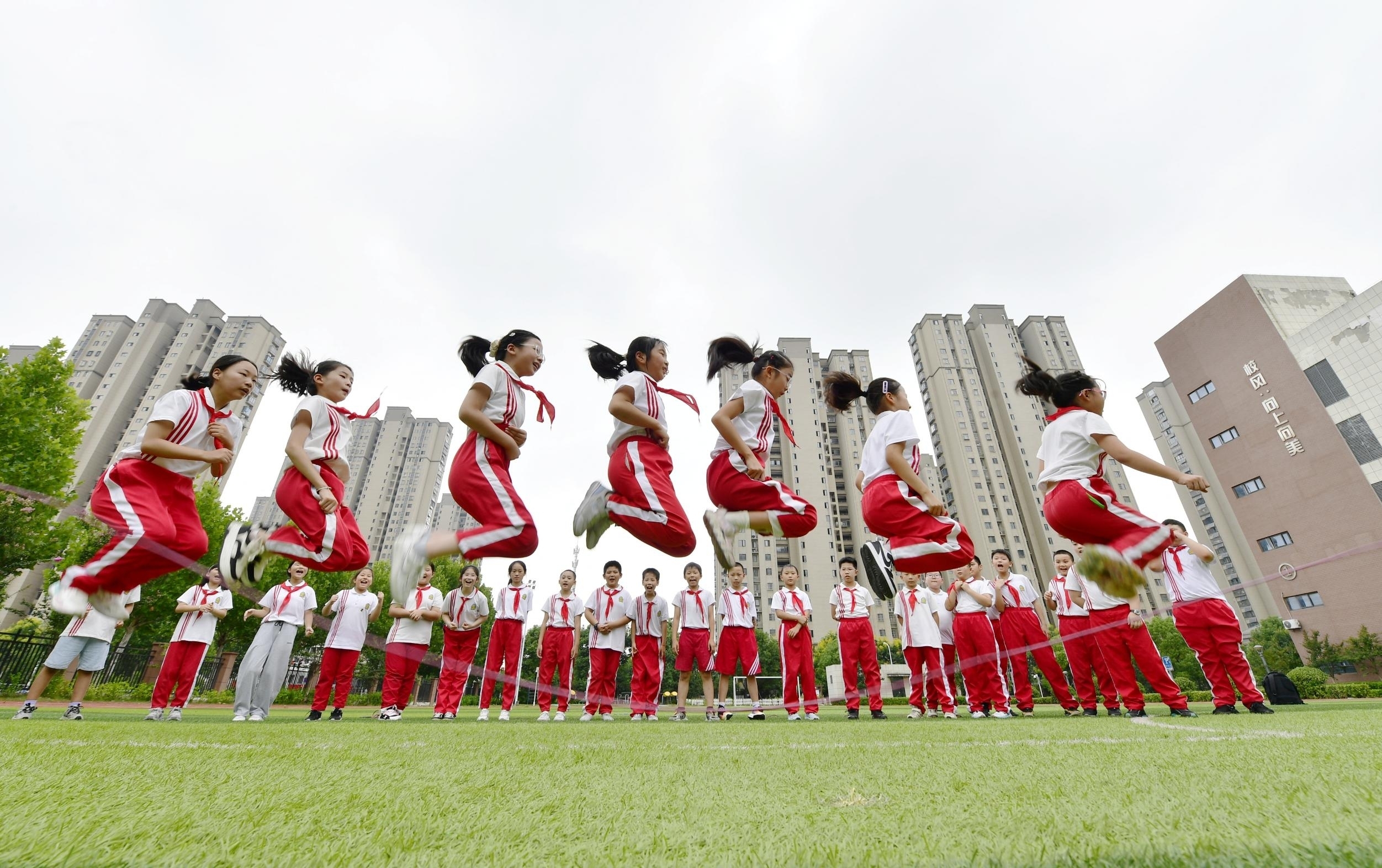 9月11日,在合肥市安居苑小学教育集团西城校区,学生在课间进行趣味活动。该校结合学生兴趣,精心策划了抖空竹、抽陀螺、竹竿舞、跳大绳、滚铁环等丰富多彩的趣味活动。同时,制定了“1+2+N”活动体系,即每天一节体育课、两个30分钟大课间、多个15分钟小课间,以“小课间”撬动“大成长”,让学生真正“走出来、动起来、乐起来”。