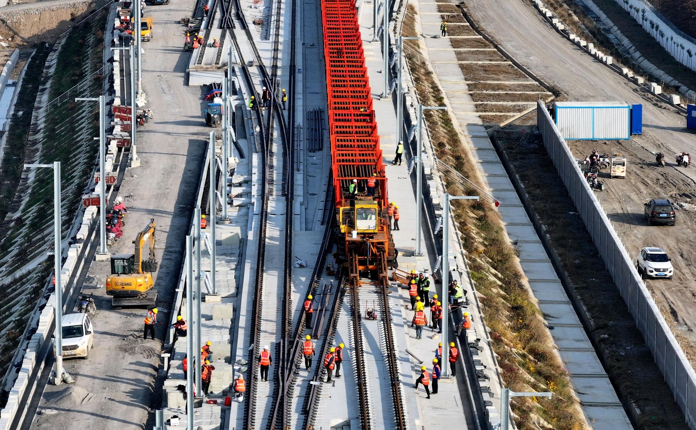 11月22日,阜淮铁路蒙城站建设现场,工人在进行轨道铺设作业。据悉,阜淮铁路建成通车后,将结束蒙城县、利辛县不通高铁的历史,对促进皖北承接产业转移集聚区建设,推动皖北地区振兴发展等有重要意义。