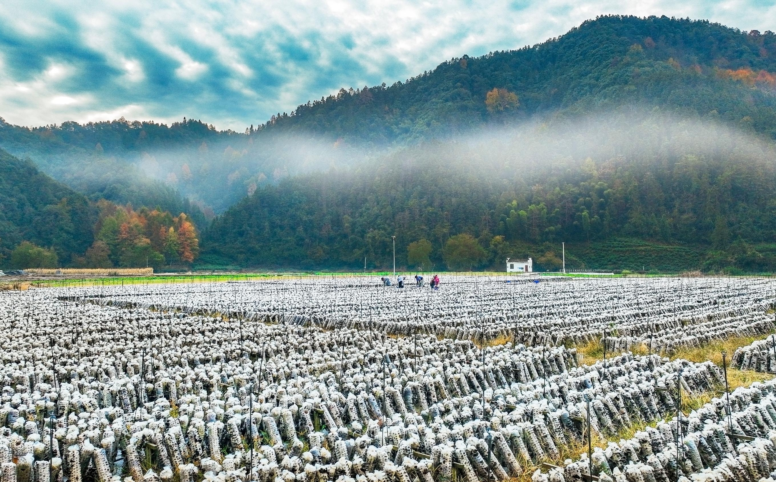 11月24日,歙县森村乡渔岸村木耳种植基地,村民穿梭在田间采收成熟的黑木耳。 该基地引入现代化农业管理设施,近日25万棒木耳迎来丰收季,预计可收获优质干木耳约4万斤,带动当地村民增收。