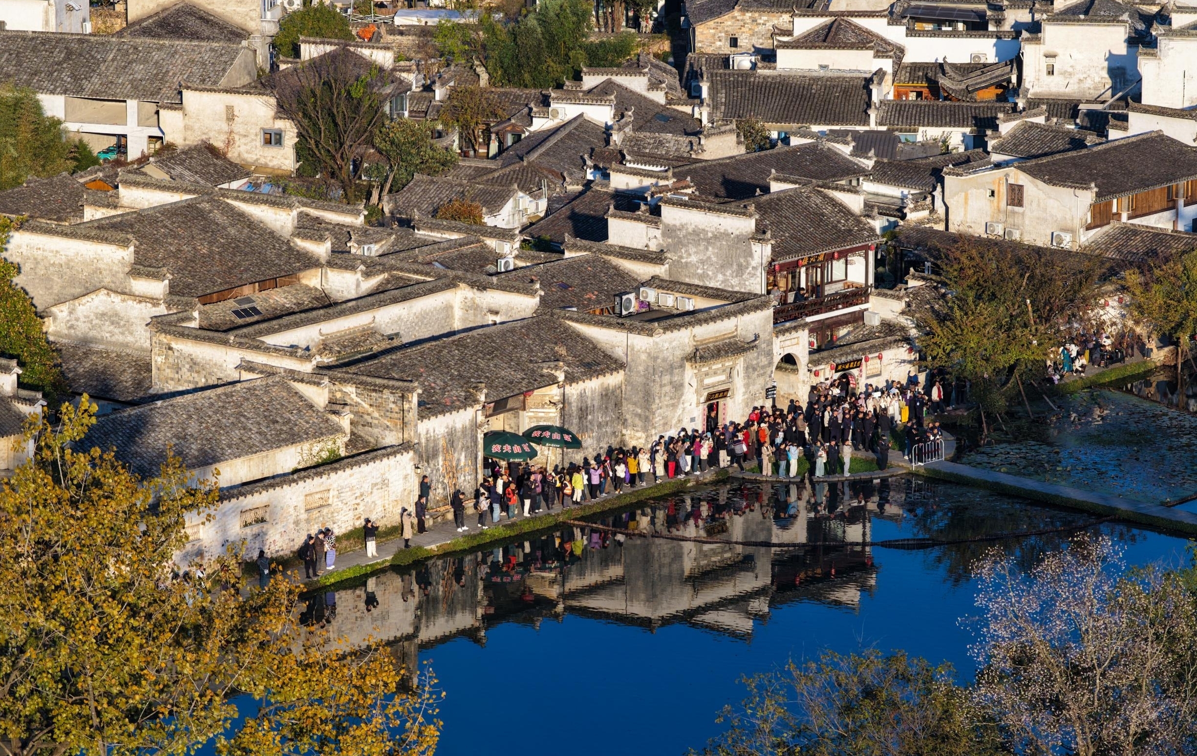 11月21日航拍的宏村。冬日里位于黄山市黟县的世界文化遗产地宏村色彩斑斓,犹如画里乡村。