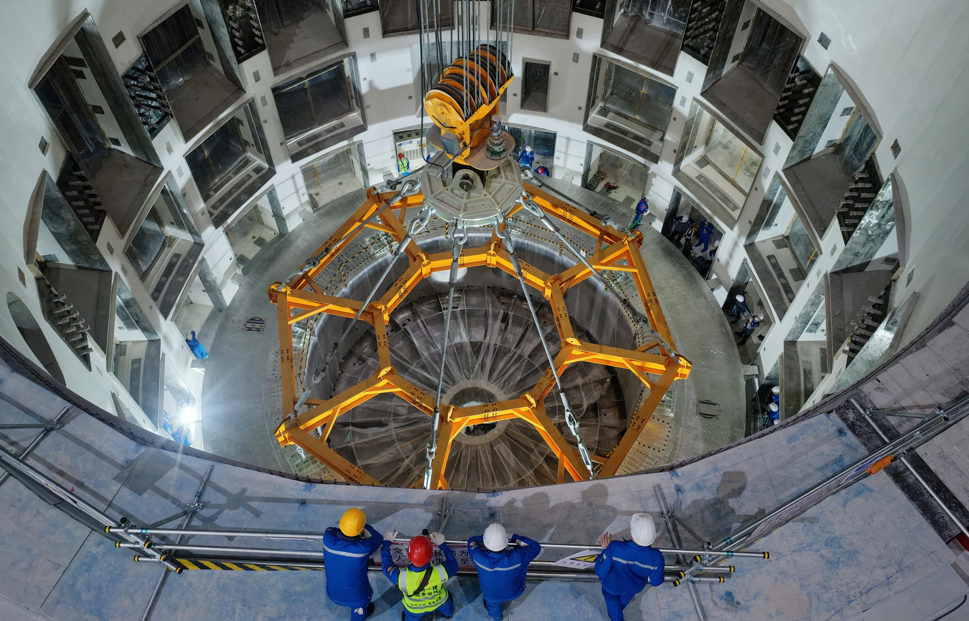 日前,陕北至安徽±800千伏特高压直流输电工程受端枢纽——合州换流站进入平波电抗器安装阶段。平波电抗器可以抑制整流电路中的有害纹波,被称作换流站的“肾脏”。图为11月27日,在庐江县,安徽送变电工程有限公司施工人员在安装合州换流站平波电抗器。