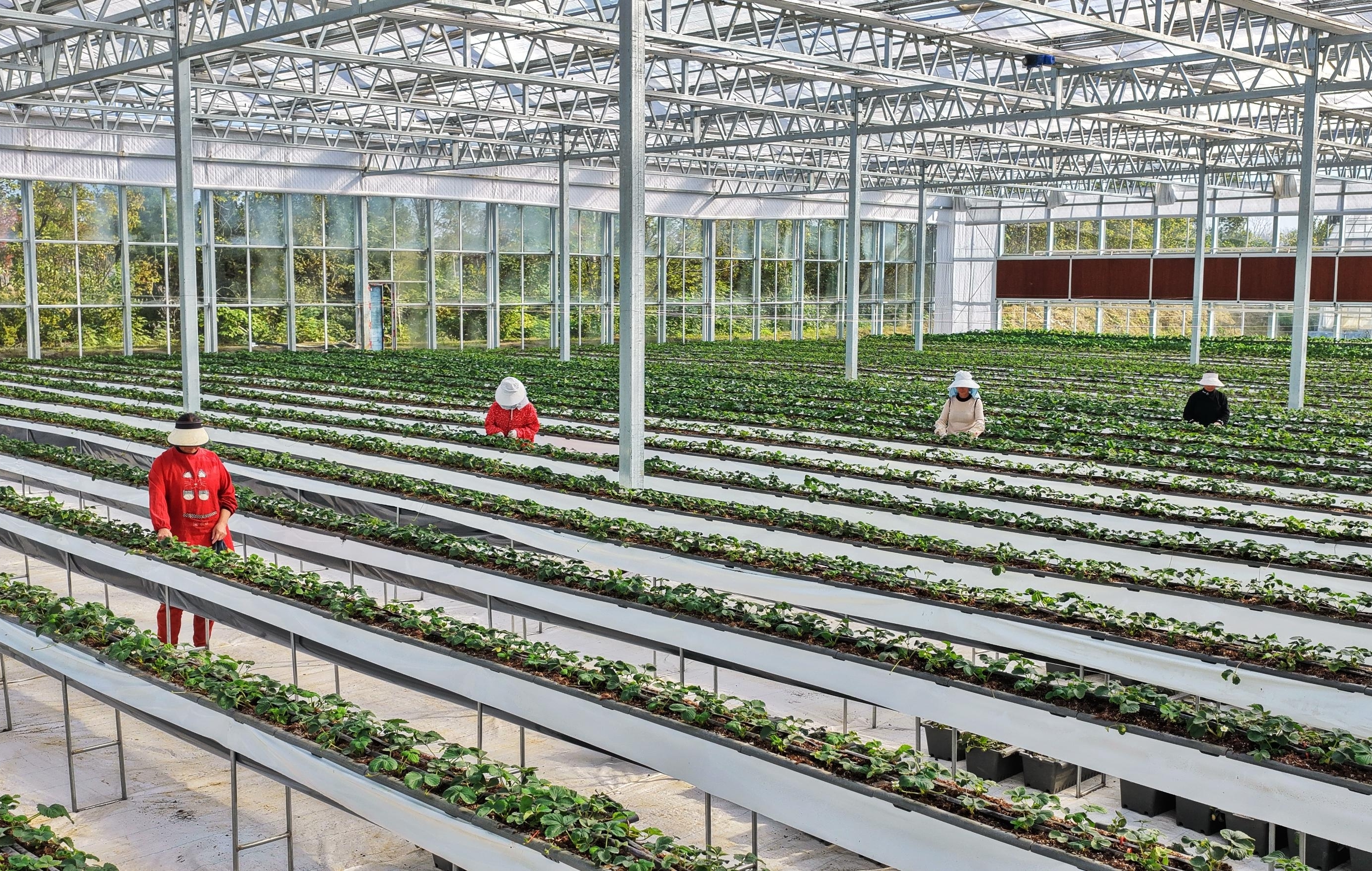 11月12日,合肥市包河区大圩镇沈福村,工人们在立体草莓种植基地内忙碌着。该基地采用立体无土栽培技术,通过高架支撑、空中悬挂及升降式种植槽等多种形式,最大化利用空间资源。据了解,基地种植的草莓早熟品种预计12月中旬陆续挂果成熟。
