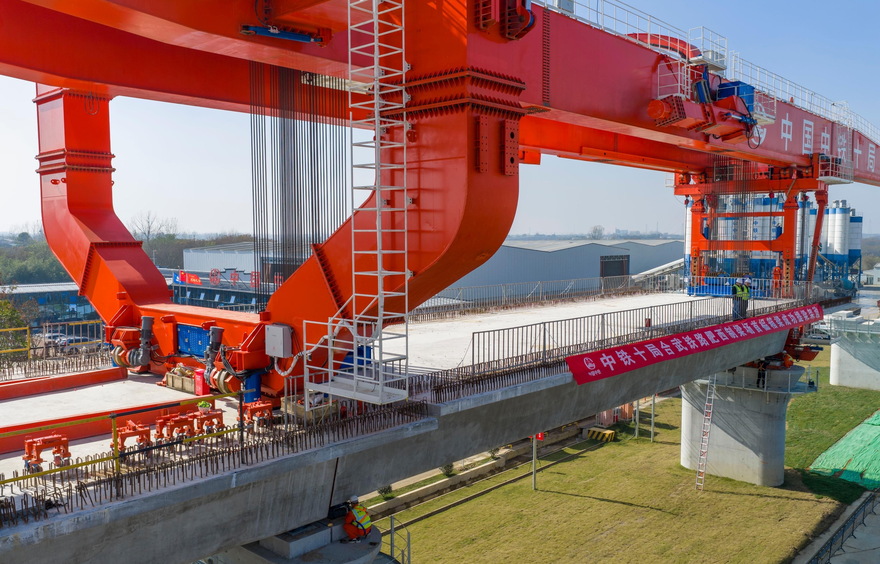 11月15日,在位于合肥的合武高铁施工现场,900吨架桥机顺利完成32.6米预制箱梁架设,标志着合武高铁安徽段架梁全面启动。