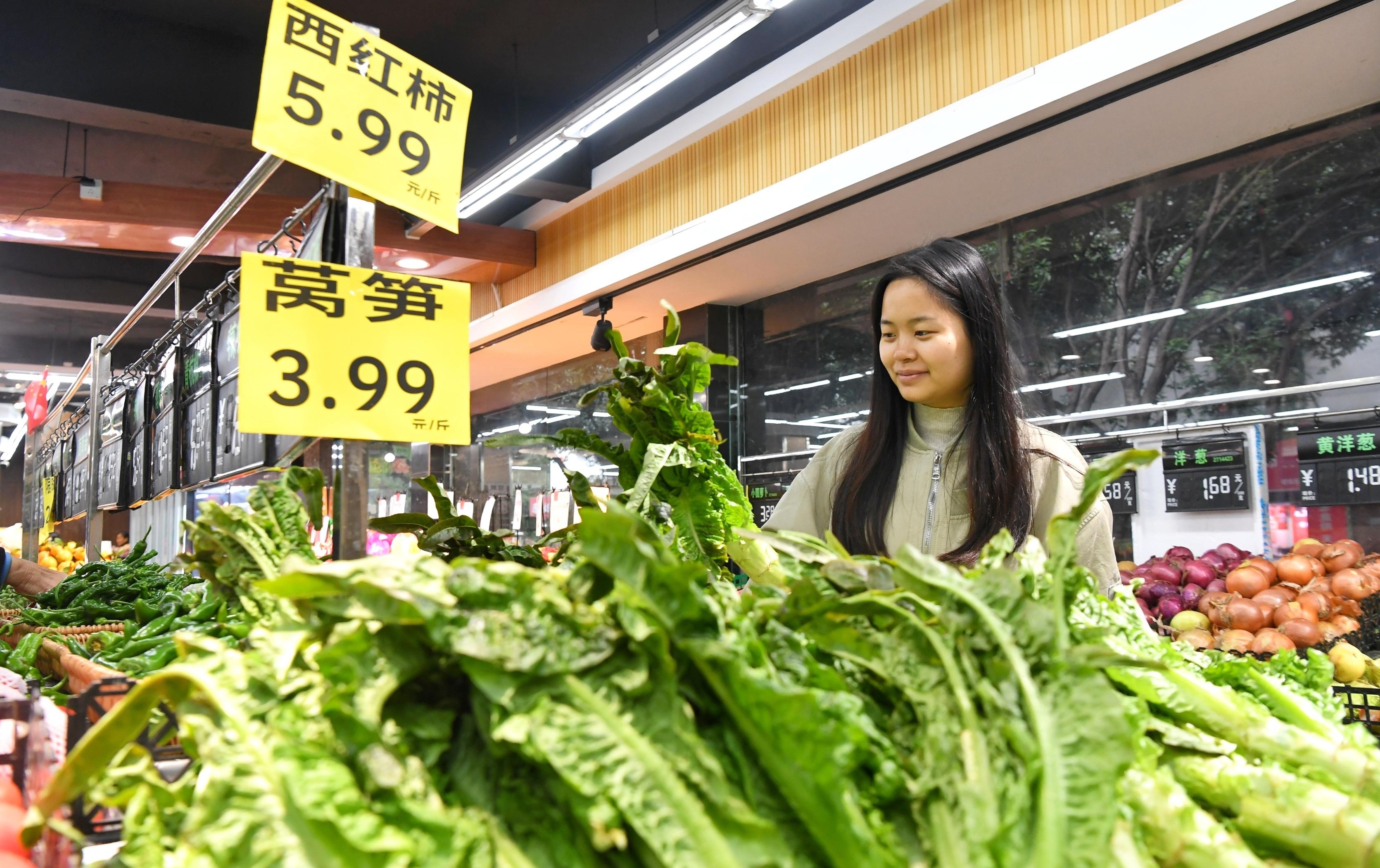11月17日,位于合肥市蜀山区琥珀街道北苑村社区的一家超市内,市民在选购新鲜蔬菜。受寒潮影响,多地气温骤降。蜀山区积极做好蔬菜保供应工作,保障市民拎稳“菜篮子”。