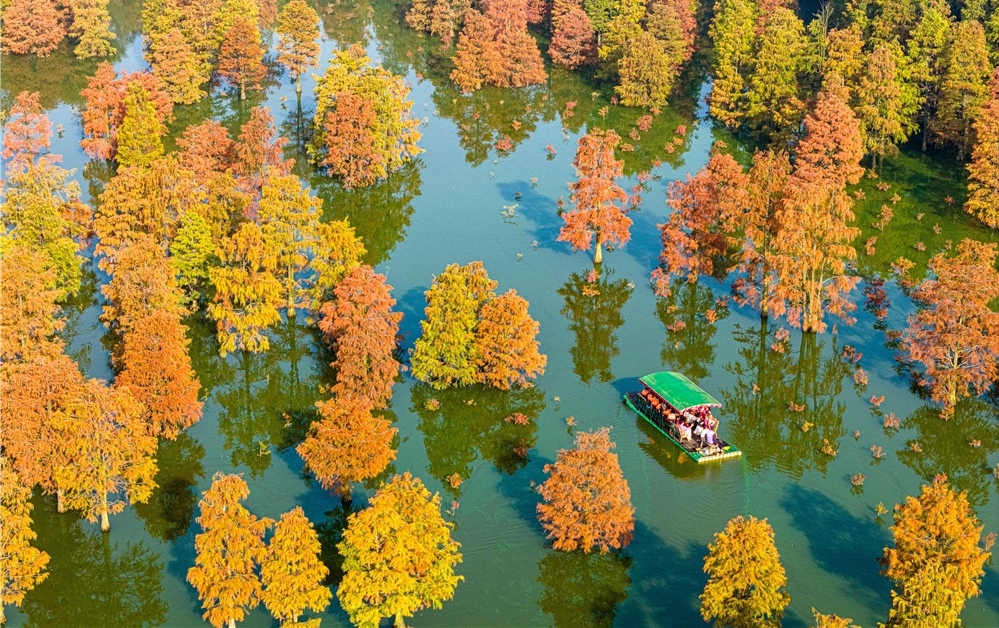 11月15日,随着气温下降,庐江县柯坦镇千年大汉塘里的数千株池杉树树叶已经转黄变红,在初冬暖阳的映照下,勾勒出一幅自然和谐的生态画卷。