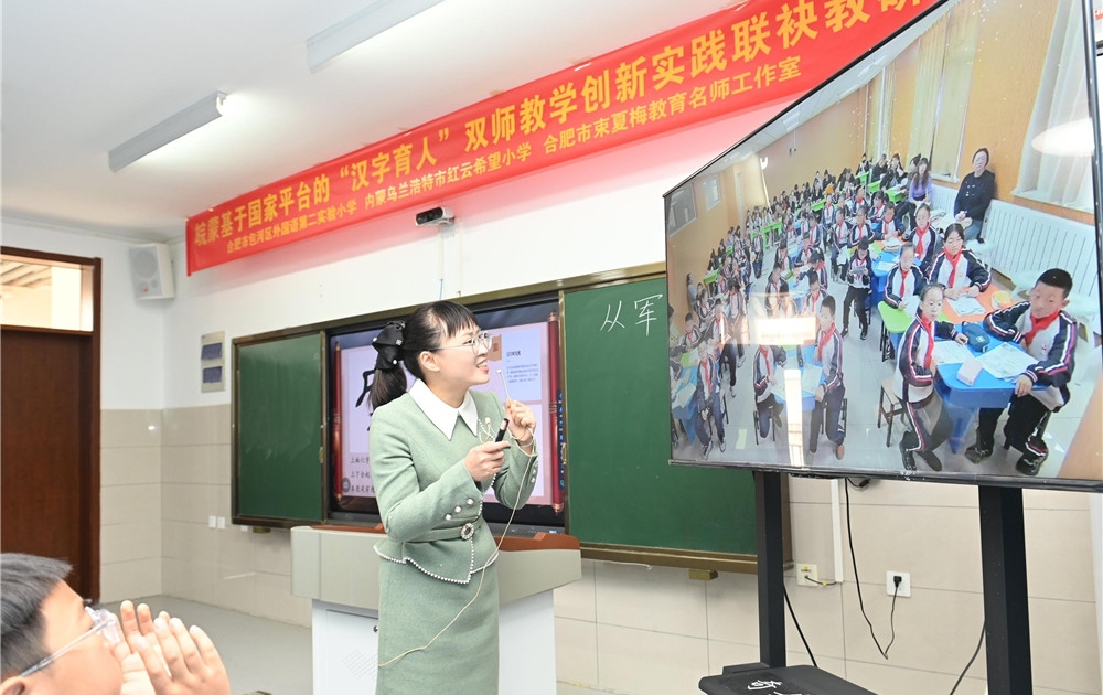 10月31日,在合肥市包河区外国语第二小学的数智教室里,该校教师陈琳在为内蒙古乌兰浩特市红云希望小学及本校学生同时授课。当日,两校举行双师教学创新实践联袂教研活动,借助国家中小学智慧教育平台和5G通信同步课堂,跨越1600多公里同上一堂课,共享优质教育资源。