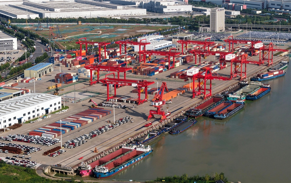 10月31日拍摄的合肥派河港码头,运输货物的车辆往来穿梭,起重机装卸作业有序。今年前三季度,安徽港口集团合肥有限公司货物吞吐量668万吨,同比增长15.8%,集装箱吞吐量41.5万标箱,同比增长7.5%。