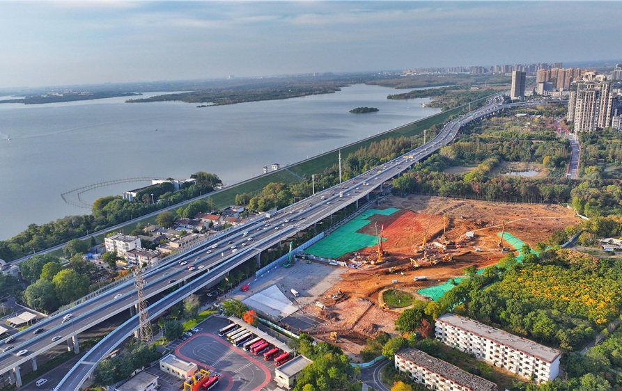11月3日拍摄的正在施工的合肥市G4001连接线(北二环西延)工程——董铺水库“下穿”工程现场。该项目建成后将与长江西路构成东西向双快速通道,在合肥市区北部形成新的交通轴。
