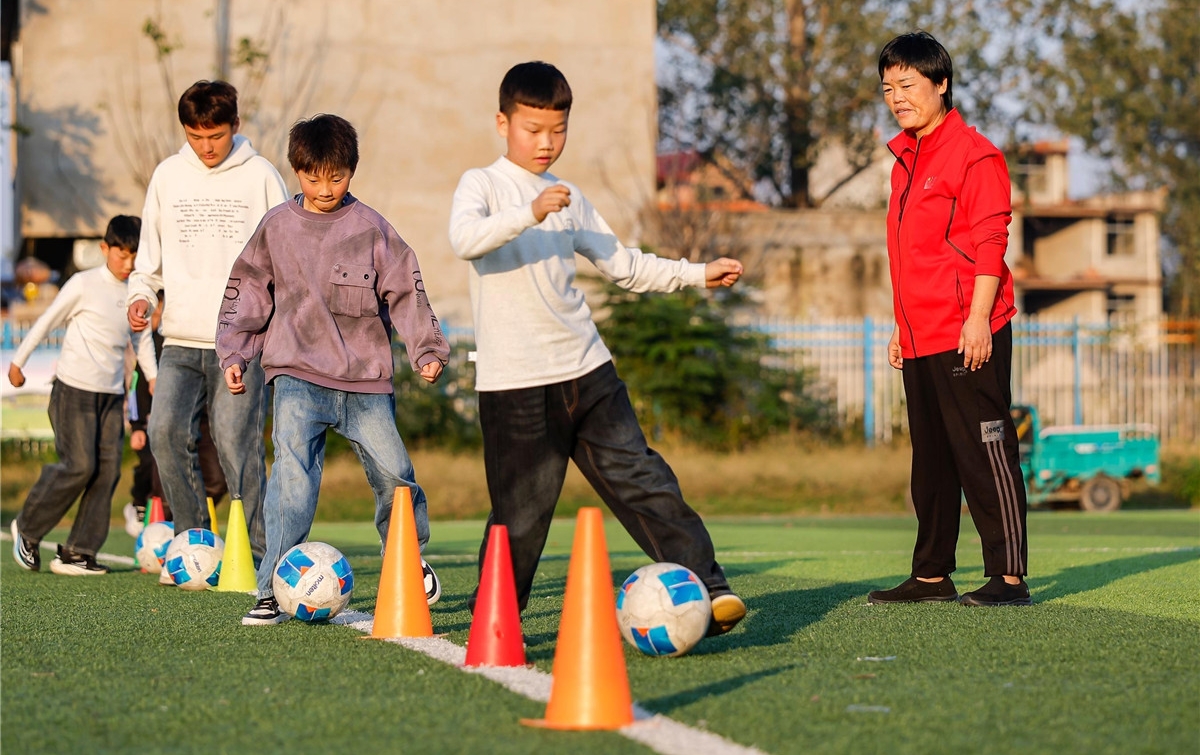 10月22日下午3点半,在阜阳市颍泉区行流镇三义学校足球场上,穿着红色运动服的体育老师王侠,在暖阳下十分醒目。此刻,她正带着10个孩子训练足球。