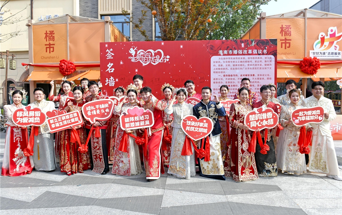 11月1日,淮南市参加公益集体婚礼的新人在婚俗改革倡议签名墙上签名后合影留念。当日,淮南市首届邻里文化周专题活动“楚韵淮香 同心永结”公益集体婚礼举行,新人们通过集体婚礼,倡导移风易俗,婚事新办简办。