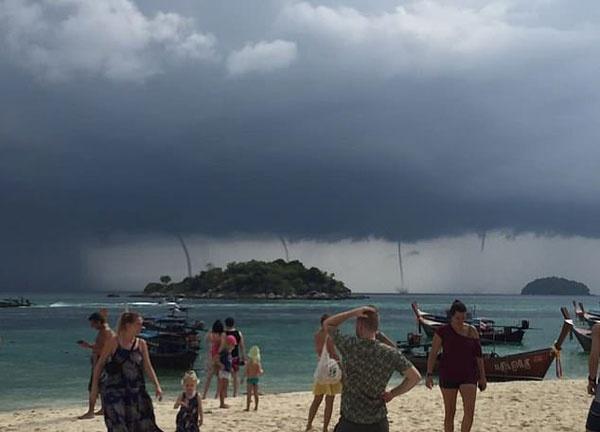 日前,一段拍自泰国南部丽贝岛(Koh Lipe)沙滩上的视频记录下了海面上同时出现四个水龙卷的奇特自然景观。视频被分享到网上后引发人们围观。