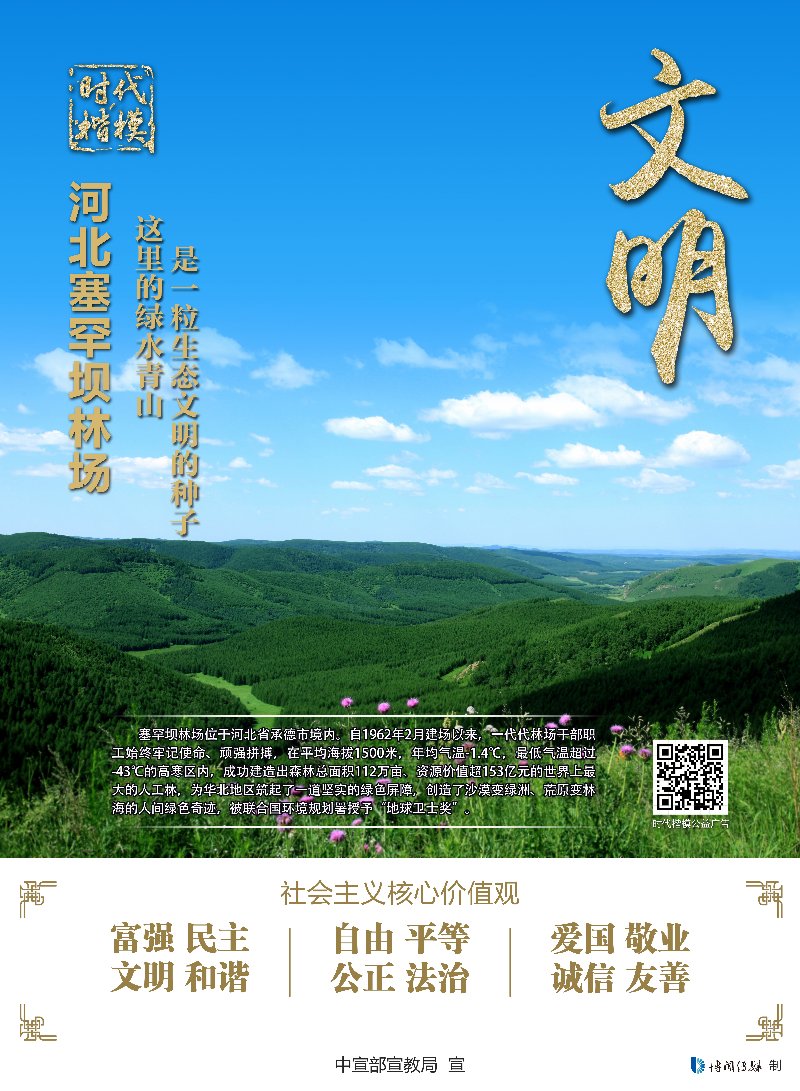 塞罕坝林场位于河北省承德市境内。自1962年2月建场以来,一代代林场干部职工始终牢记使命、顽强拼搏,在平均海拔1500米,年均气温-1.4℃,最低气温超过-43℃的高寒区内,成功建造出森林总面积112万亩、资源价值超153亿元的世界上最大的人工林,为华北地区筑起了一道坚实的绿色屏障,创造了沙漠变绿洲、荒原变林海的人间绿色奇迹,被联合国环境规划器授予“地球卫士奖”。