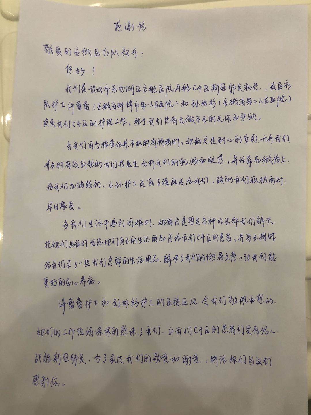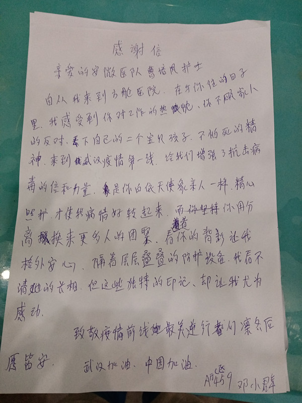 “看着你的背影让我格外安心,隔着层层叠叠的防护设备,我看不到她的长相,但这些独特的印记,却让我尤为感动。”年过六旬的邓阿姨在方舱治疗的近一个月时间里对安徽省第二人民医院曹培凤的感激最多、感动最深。邓阿姨将这份感情写在了一张A4大小的纸上,信中字里行间流露出她对安徽支援湖北医疗队医护人员的感激之情。“丢下自己两个宝贝孩子,来到了武汉疫情的第一线,给了我们抗击病毒的信心和力量。”因为家庭聚集性发病,邓阿姨时常情绪不高,在她最脆弱、最虚弱的时候,曹培凤总是毫无畏惧地前来帮助,给予她战胜病魔的力量。
