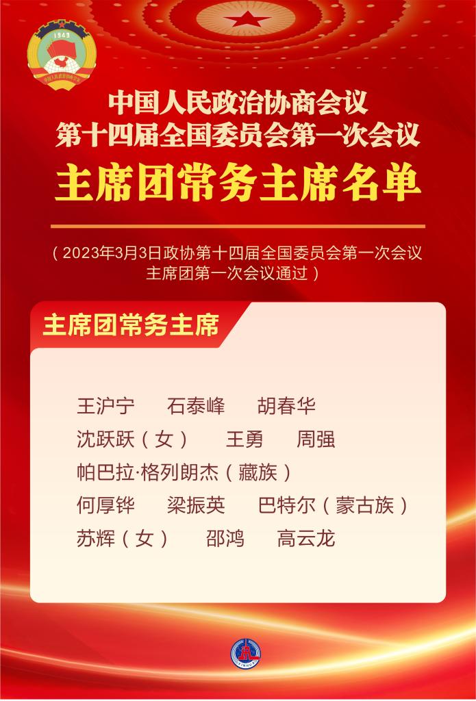 (两会受权发布)中国人民政治协商会议第十四届全国委员会第一次会议主席团常务主席名单