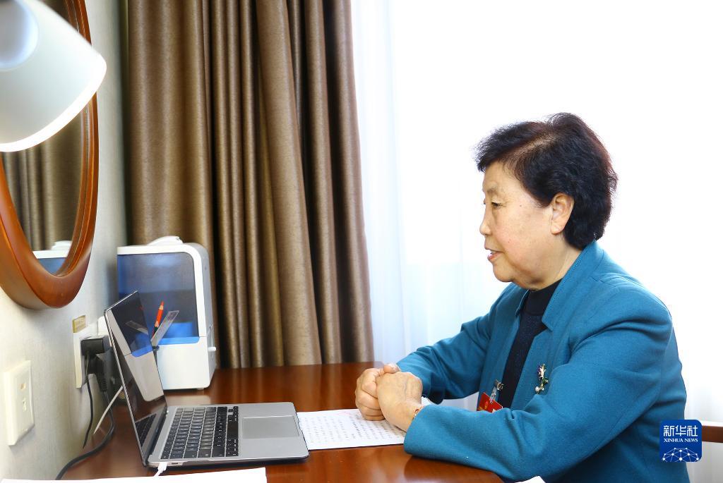 3月8日,全国人大代表、山西省昔阳县大寨镇大寨村党总支书记郭凤莲在驻地与农业农村部工作人员视频连线。新华社记者 胡喆 摄
