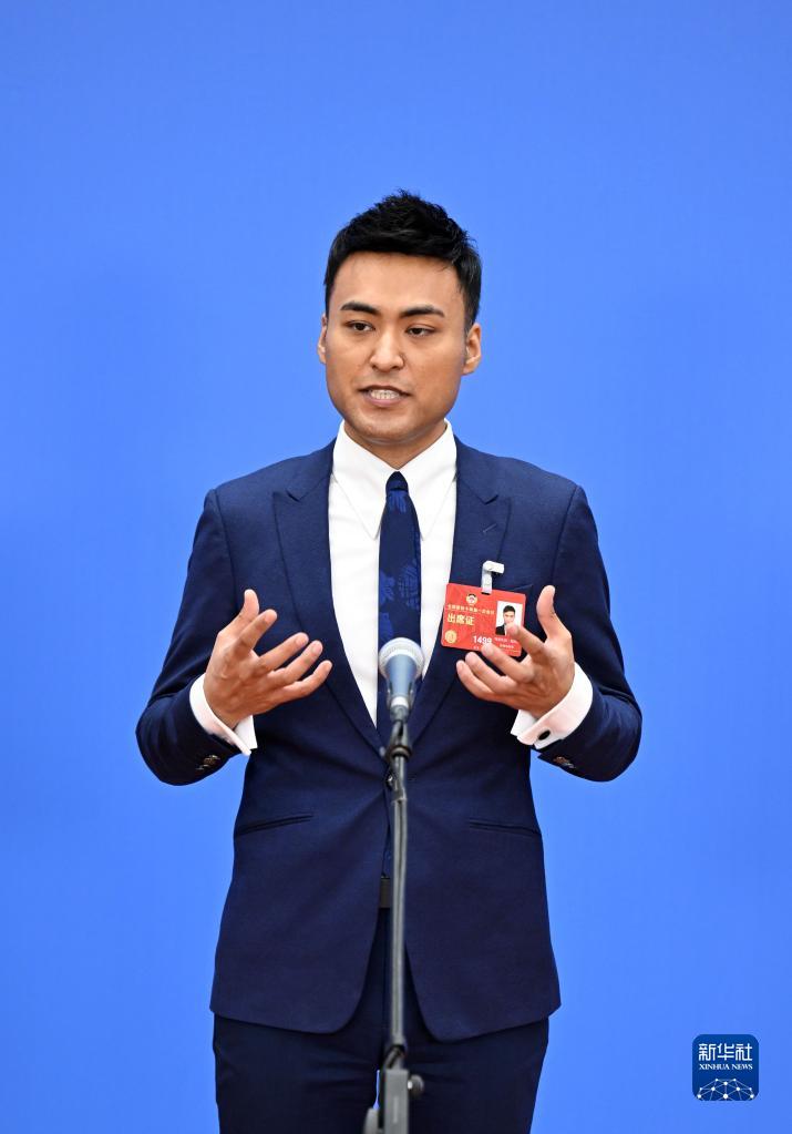 3月7日,全国政协十四届一次会议第二场“委员通道”集体采访活动在北京人民大会堂新闻发布厅举行。这是全国政协委员琼色接受媒体采访。新华社记者 陈晔华 摄