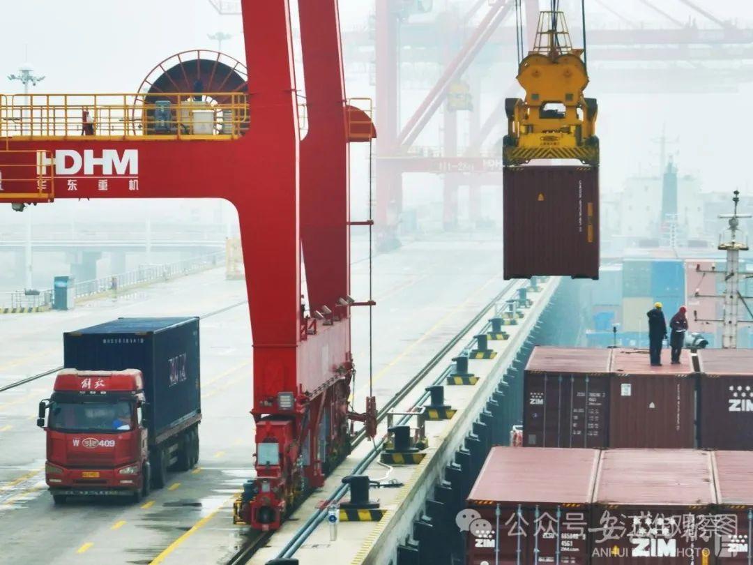 在芜湖港集装箱码头,吊机上下挥舞着巨大的手臂,将集装箱轻松提起,又稳稳放到货船上。远处,汽笛声声,货船在海上行驶着。
