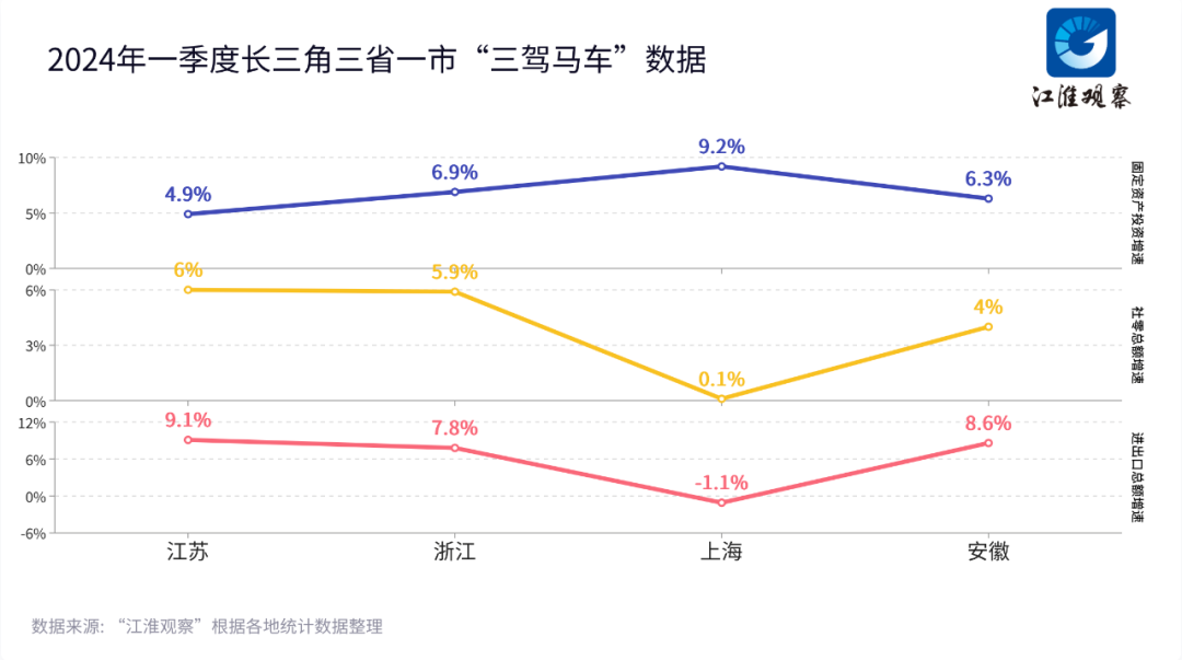 总体来看,在外部环境的不确定性上升、有效需求不足的情况,今年长三角开局依然平稳,且积极向好。三省一市你追我赶,继续发挥着经济“挑大梁”的作用。