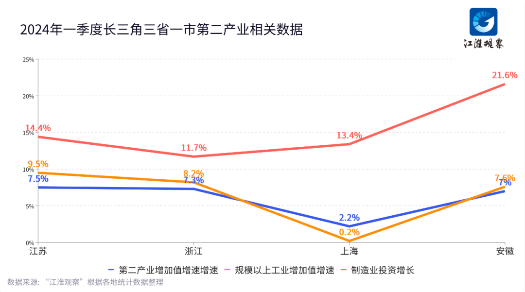 工业同样的支撑作用,也发生在苏浙两省。数据显示,一季度,江苏、浙江第二产业增速分别为7.5%、7.3%,规上工业增加值同比增长分别为9.5%、8.2%。