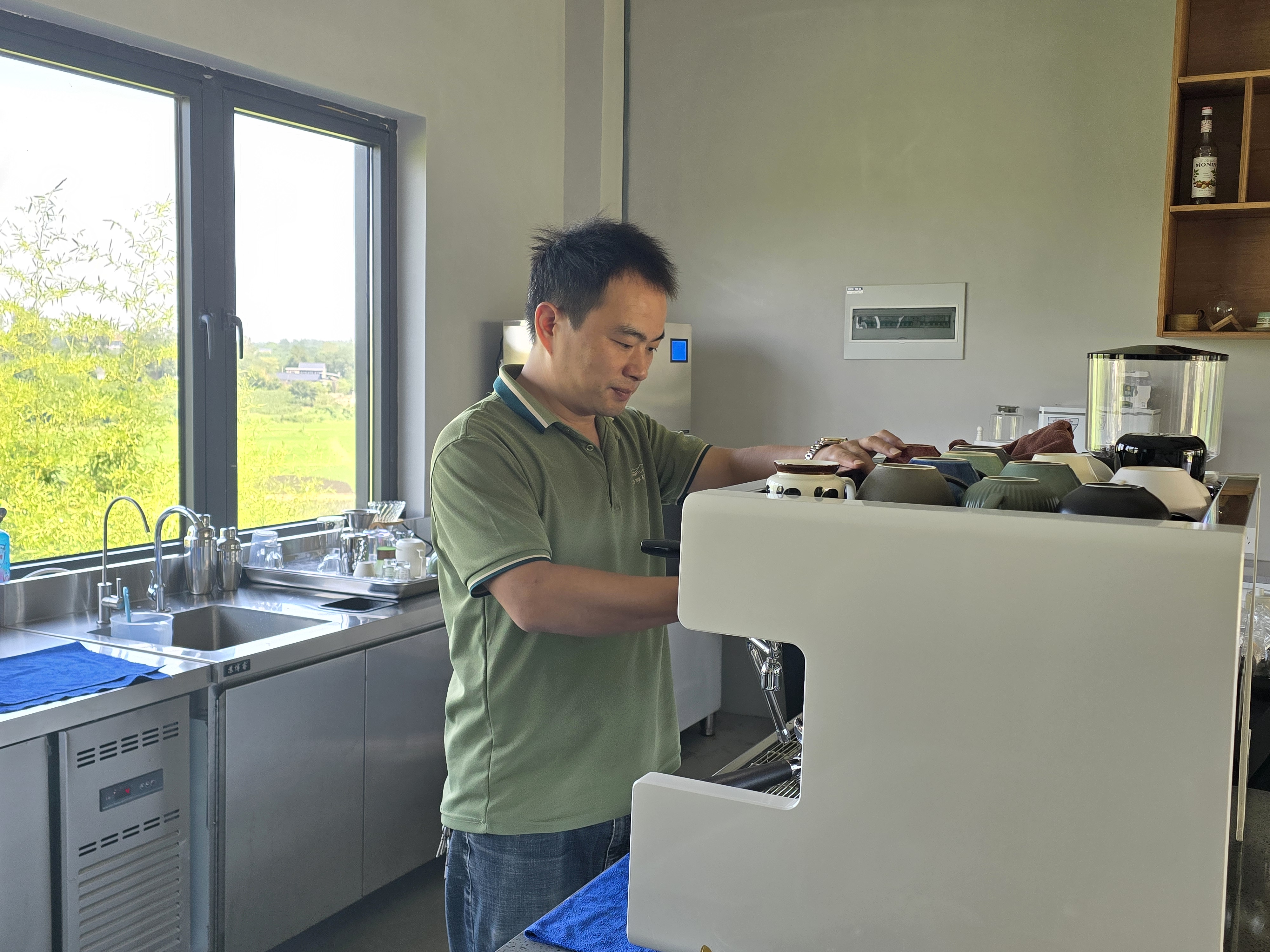 村民章亮在梦享村实现了开一家咖啡厅的梦想,图为章亮正在制作瓜片咖啡。 本报记者 袁野 摄