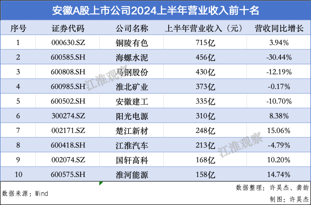 上半年,安徽上市公司营收前十名的企业分别是铜陵有色(715亿)、海螺水泥(456亿)、马钢股份(430亿)、淮北矿业(373亿)、安徽建工(335亿)、阳光电源(310亿)、楚江新材(248亿)、江淮汽车(213亿)、国轩高科(168亿)、淮河能源(158亿)。