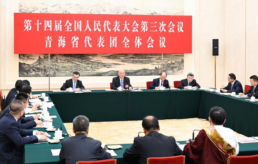 3月7日上午,中共中央政治局常委、中央书记处书记蔡奇来到他所在的青海代表团,同代表们一起审议。新华社记者 申宏 摄
