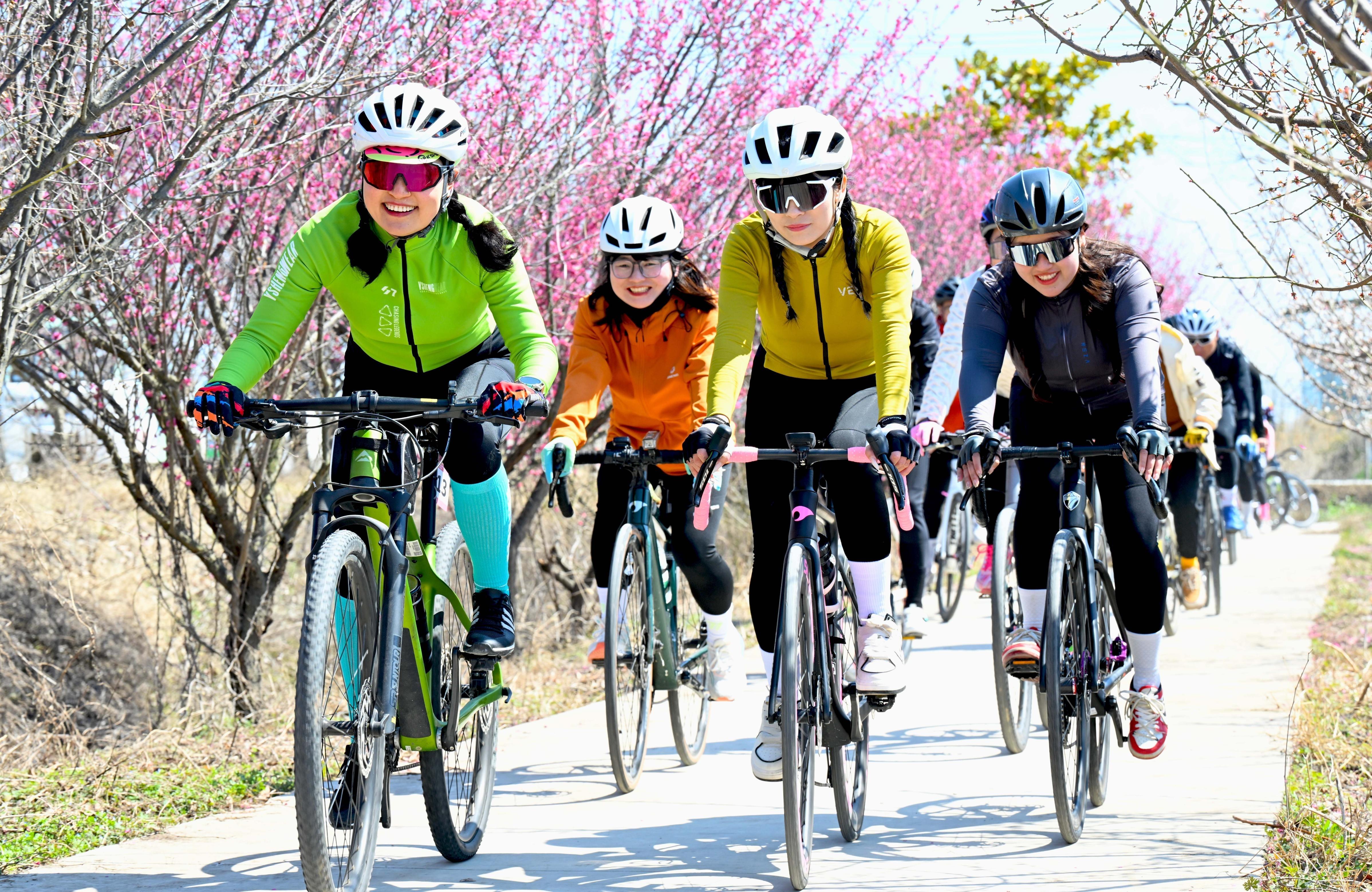 3月16日,在亳州市利辛县永兴镇青梅产业园,骑行爱好者在花海中骑行、赏花。本报通讯员 刘勤利 何永芹 摄